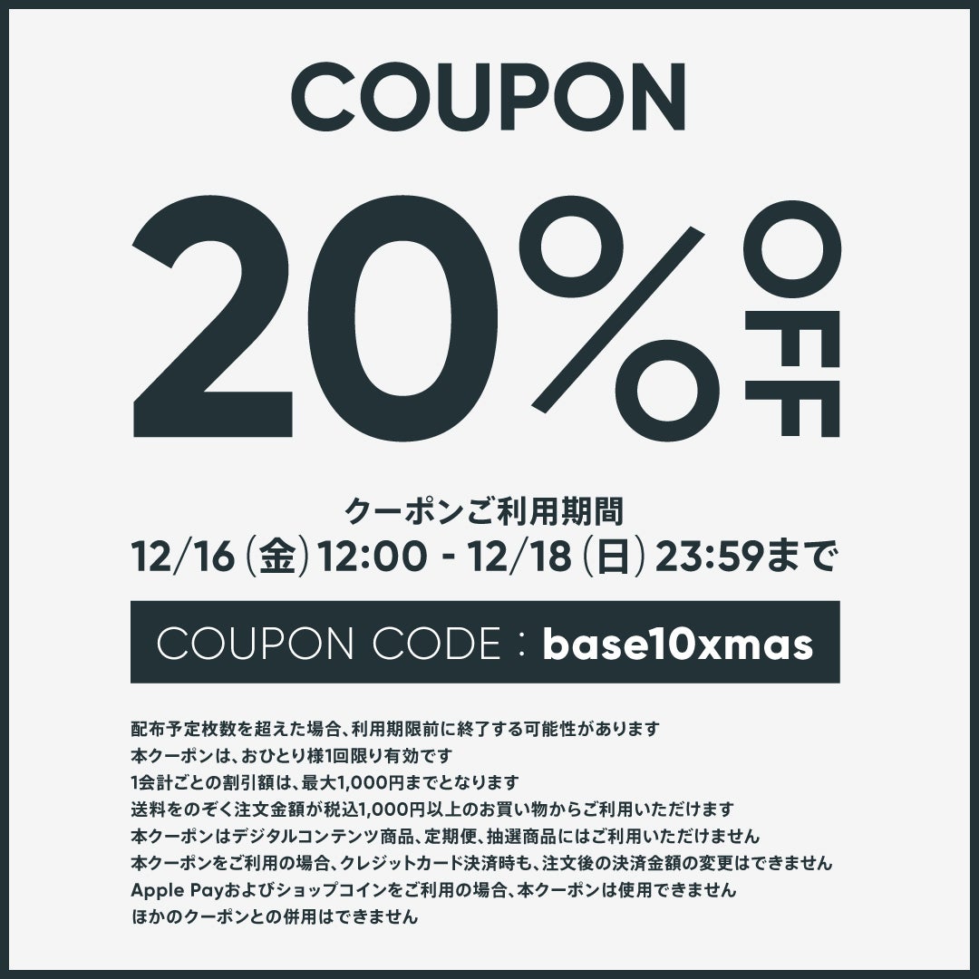 商品購入画面でクーポンコード「base10xmas」を入力してください。