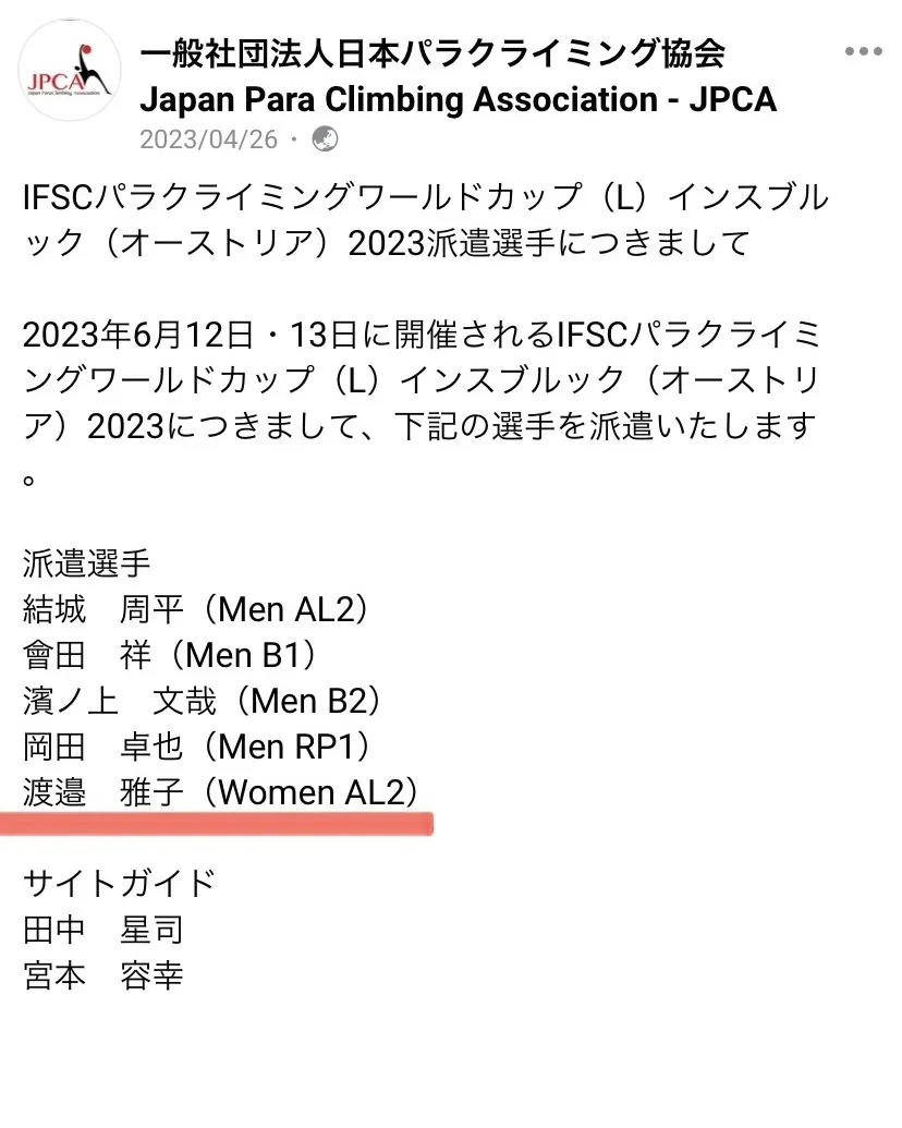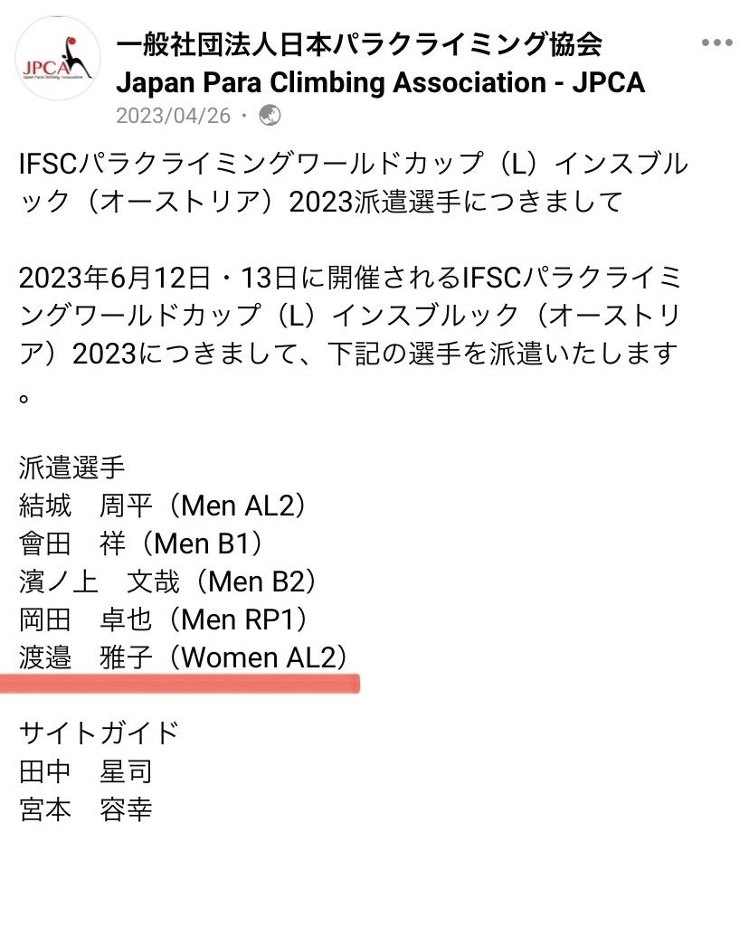 6月1日からパラアスリートとしてEY新日本有限責任監査法人に所属しました。専業主婦から22年ぶりの就職です。企業の支援をいただけて、パラクライミングの国際大会すべてに出場する、新しい可能性が開けました。いろいろなかたちで関わって私をここまで連れてきてくださっているみなさんに、改めて感謝の気持ちでいっぱいです。
