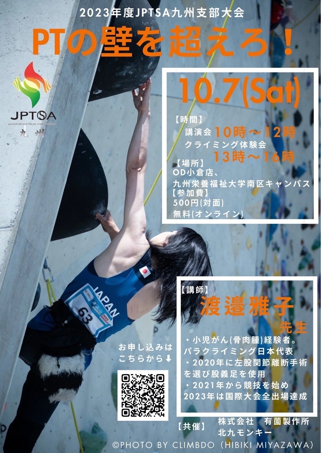 10月7日(土)日本理学療法学生協会(JPTSA)九州支部大会でお話しする機会をいただきました。JPTSA九州支部で、全国の理学療法を学ぶ方を対象に、9月30日(土)まで参加者募集中です。福祉機器業界大手の株式会社有薗製作所さんとクライミング団体の北九モンキーさんの共催をいただき、クライミング体験会も開かれます。