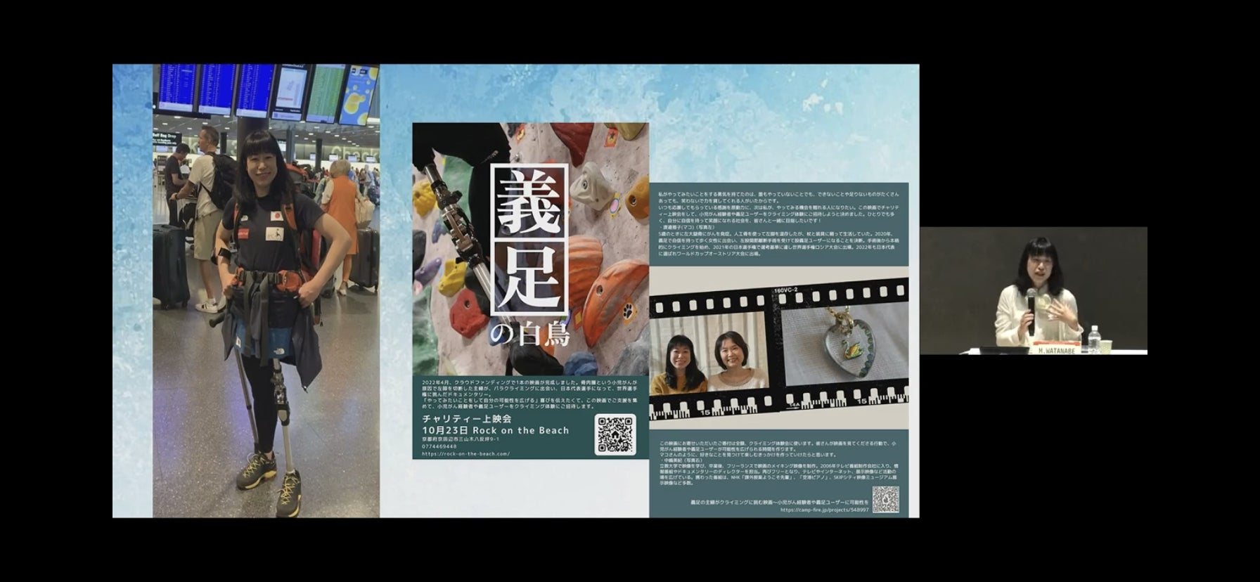 ドキュメンタリー「義足の白鳥」も紹介しました。小児がん経験者の支援団体や医療関係者が関心を持ってくださり、クライミング体験をしたい子どもへの呼びかけをお願いしました。クライミングは危ないと思われがちなので、私ももっとうまく魅力を伝えて体験会を実現できるように考えます。