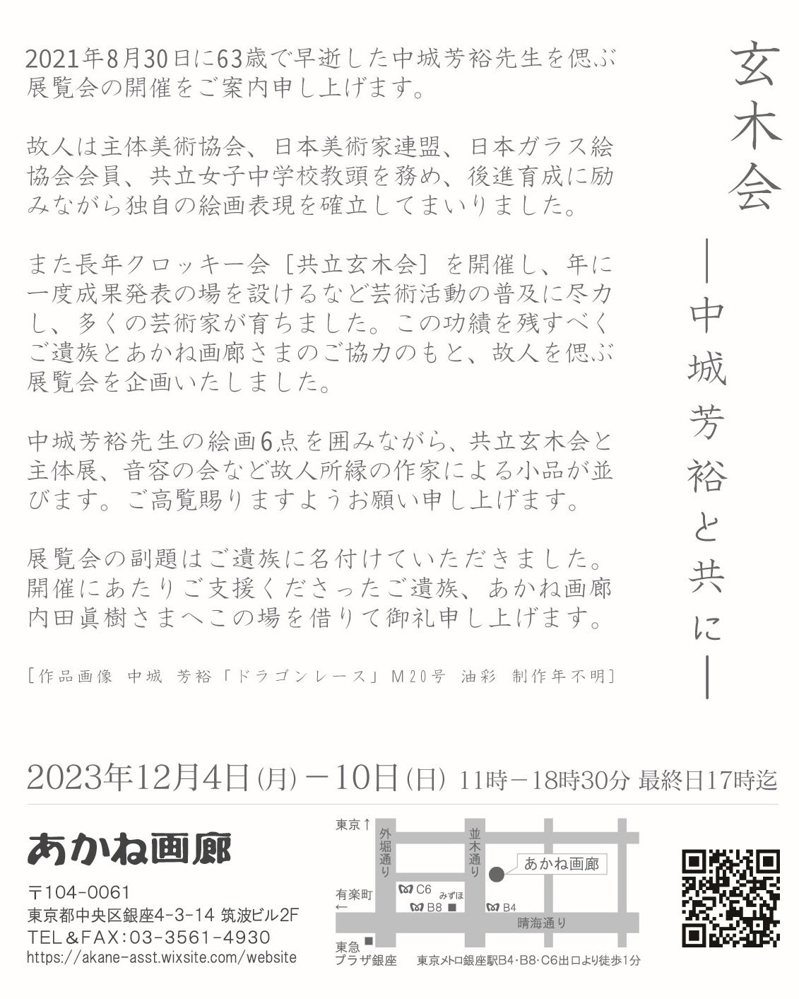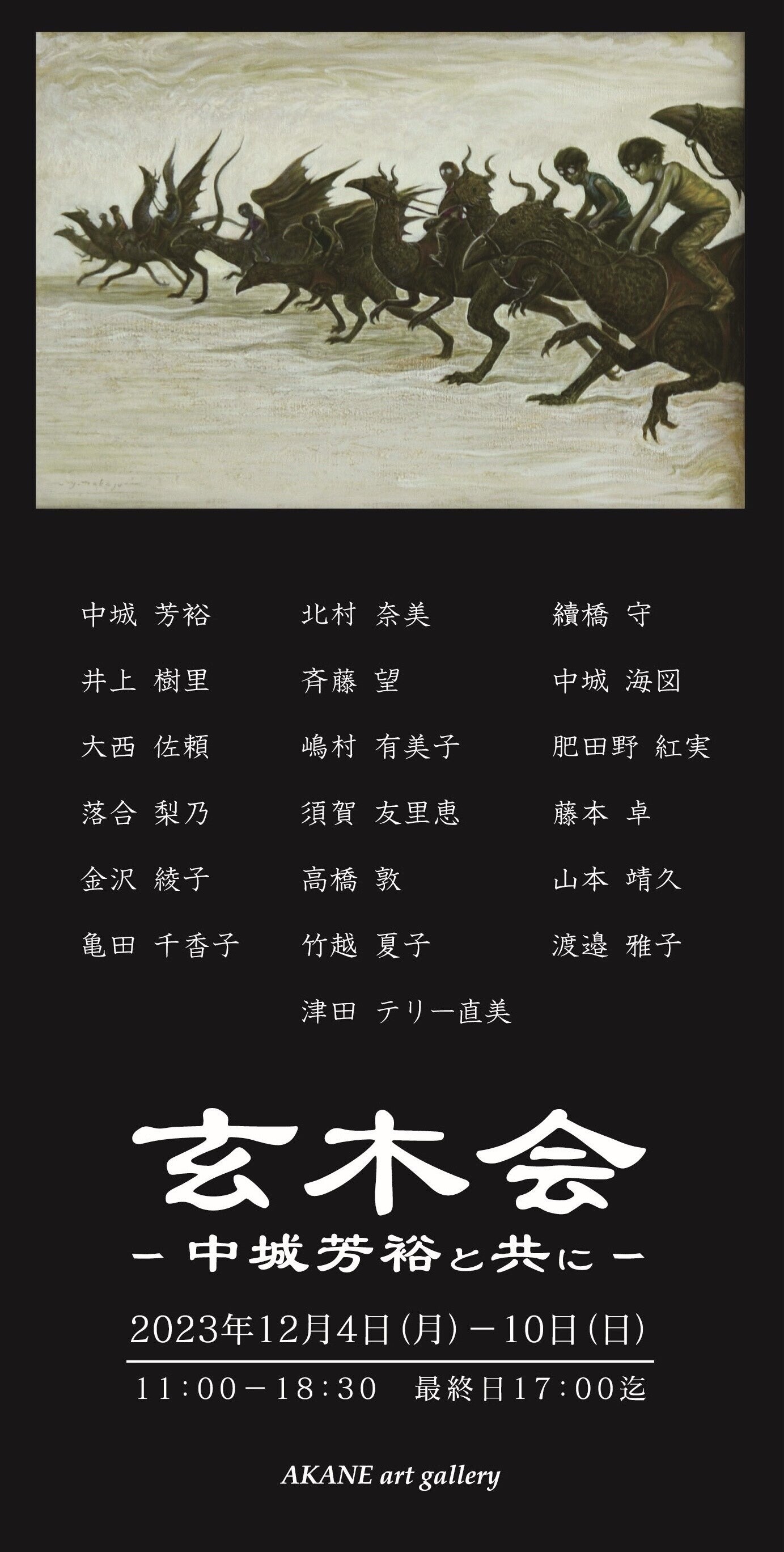 12月4日から1週間、銀座あかね画廊で、グループ展に参加します。故中城芳裕先生の教え子や縁ある作家が集まった祭りです。私は書き下ろしのM3号アクリル画1点を出品予定です。