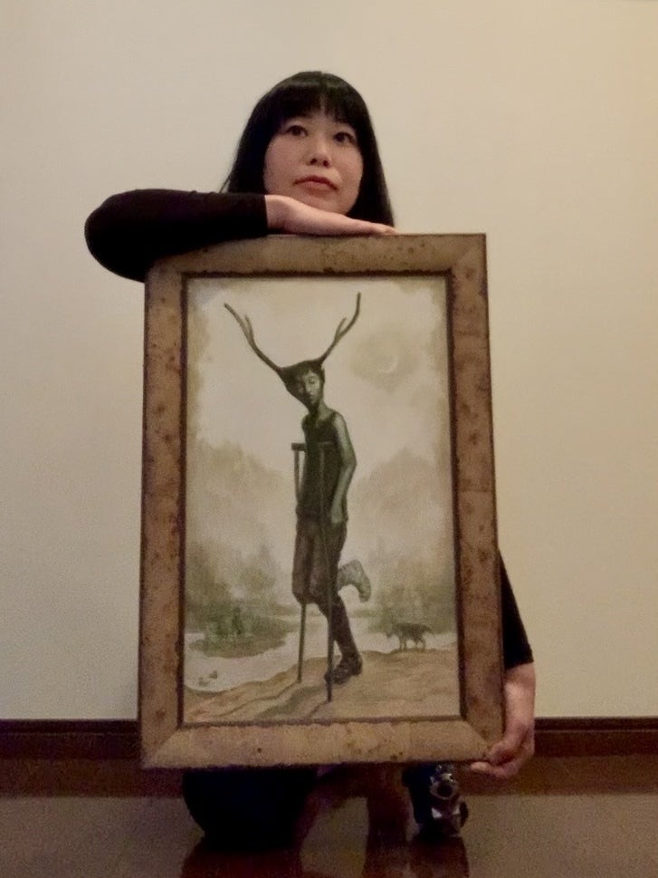 中城先生の作品。去年の遺作展で見た瞬間、先生わたしを描いたんだって思った。先生と初めて会った時の私は松葉杖2本で通学してたから。違うかもしれないけど、いいの。これは私だから一緒に暮らそうって思った。筆の跡を見るたび、先生の時間と思考と手の動きがここに入ってるって感じる。