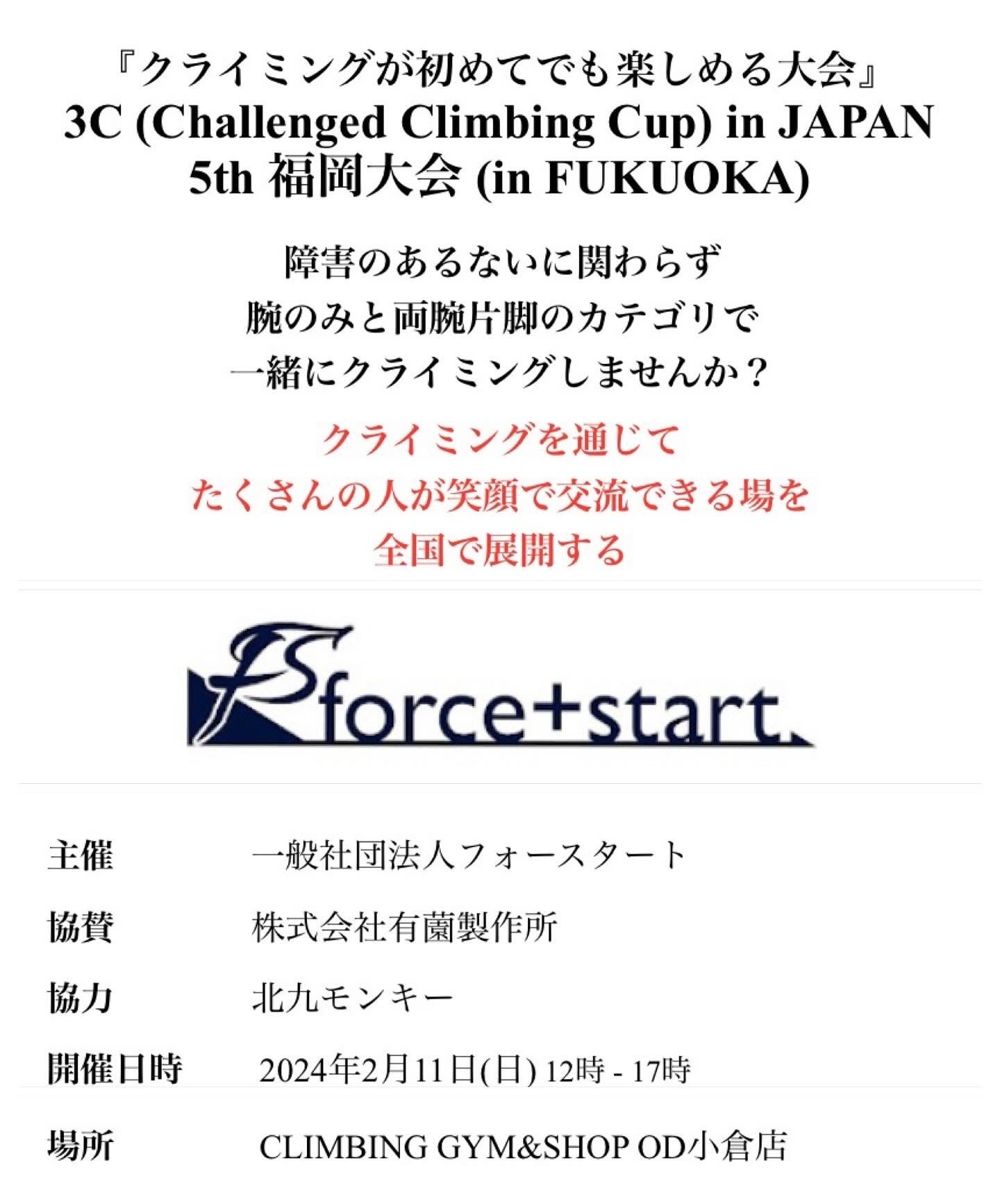 2月11日、福岡県北九州市で、一般社団法人フォースタート主催のパラクライミングイベント「3C」が行われます。