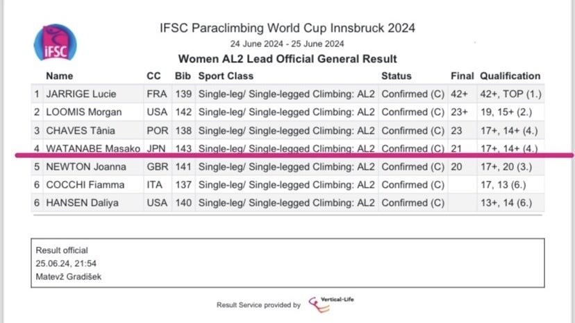 ワールドカップ・インスブルック大会決勝、4位で終わりました。左脚を切断した新しい体でクライミングを始めて3年半。ずっと憧れだったり励まされてきた選手たちと、ようやく同じ舞台に立てました。