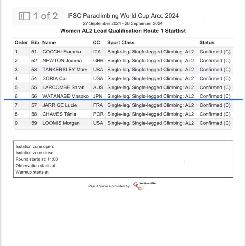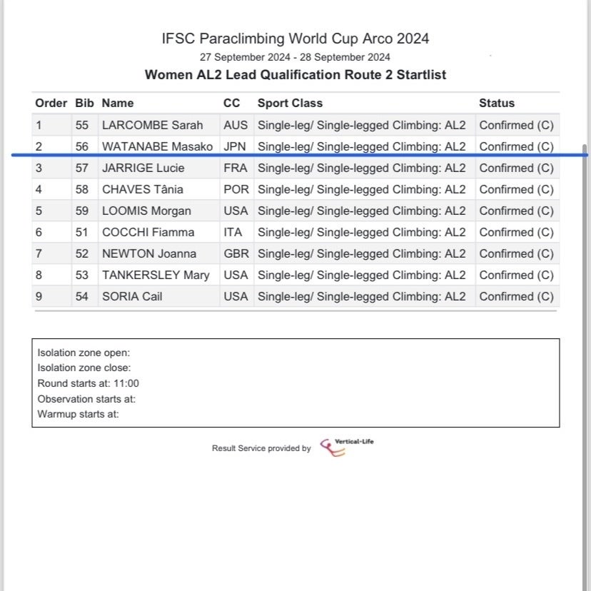 日本時間9月27日18:00から、IFSCパラクライミングワールドカップ・アルコ大会予選が行われます。今年最後の国際大会、2度目の決勝進出、がんばります。予選は中継がありませんが、心の中で応援お願いします。