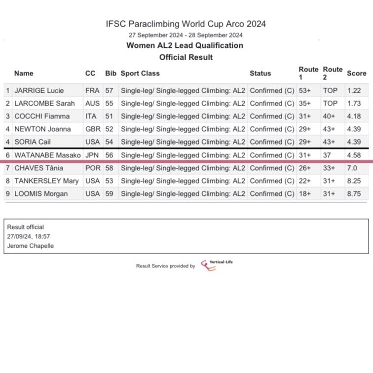 予選1本目では過去最高の3位を叩き出せて、予選2本目ではIFSCのコメンテーターに「パラはかっこいい」とたいへん励みになる動画を撮ってもらいました。ああもっともっと高くに行きたい、って思ったから、またクライミングを続けます。そういう気持ちで今年最後の国際大会を終えられたことが、私の結果です。