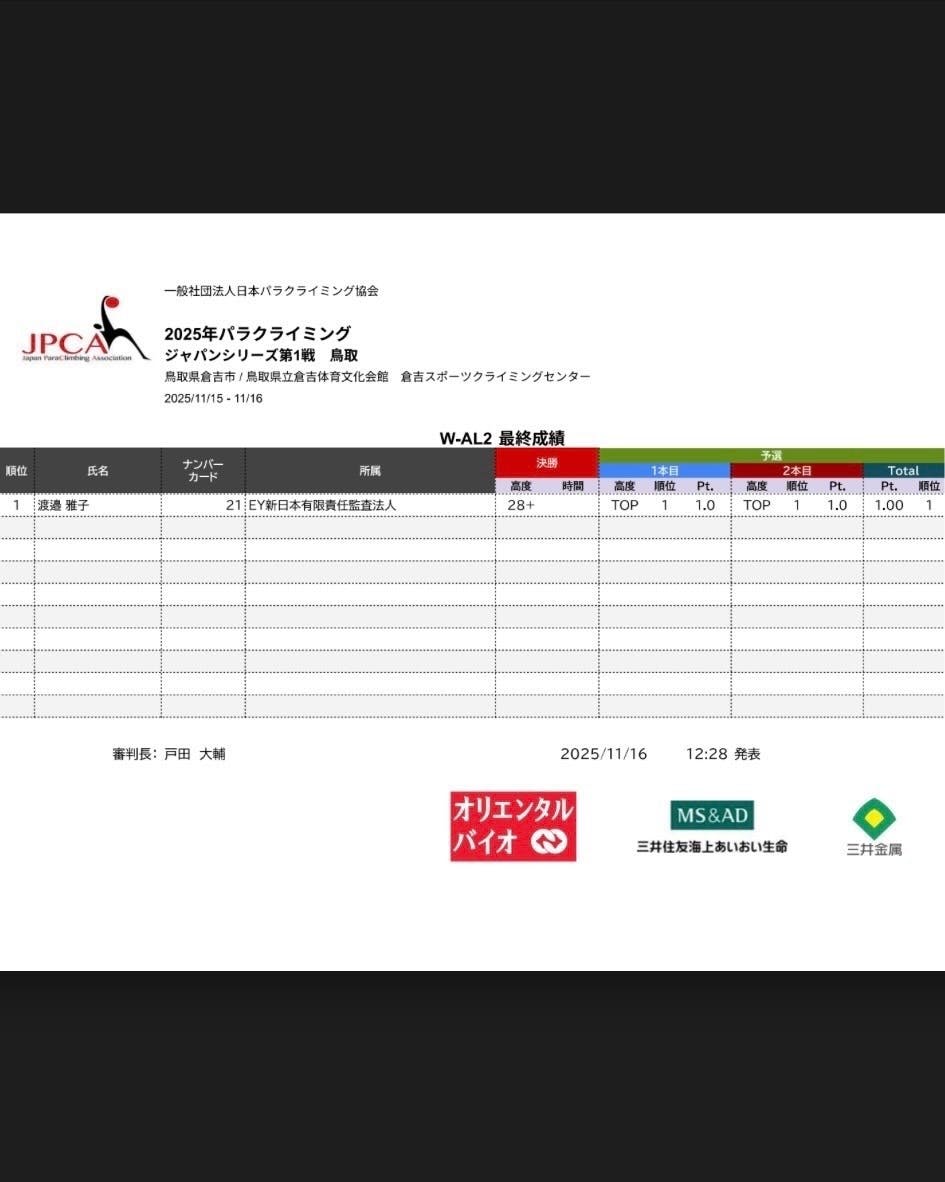 パラクライミングジャパンシリーズ・倉吉大会、応援どうもありがとうございました!今年最後の大会をW-AL2カテゴリー1位で終えました。選手たちの日々の取り組みを表現する場を作ってくださった大会運営の皆さまに深く感謝しています。