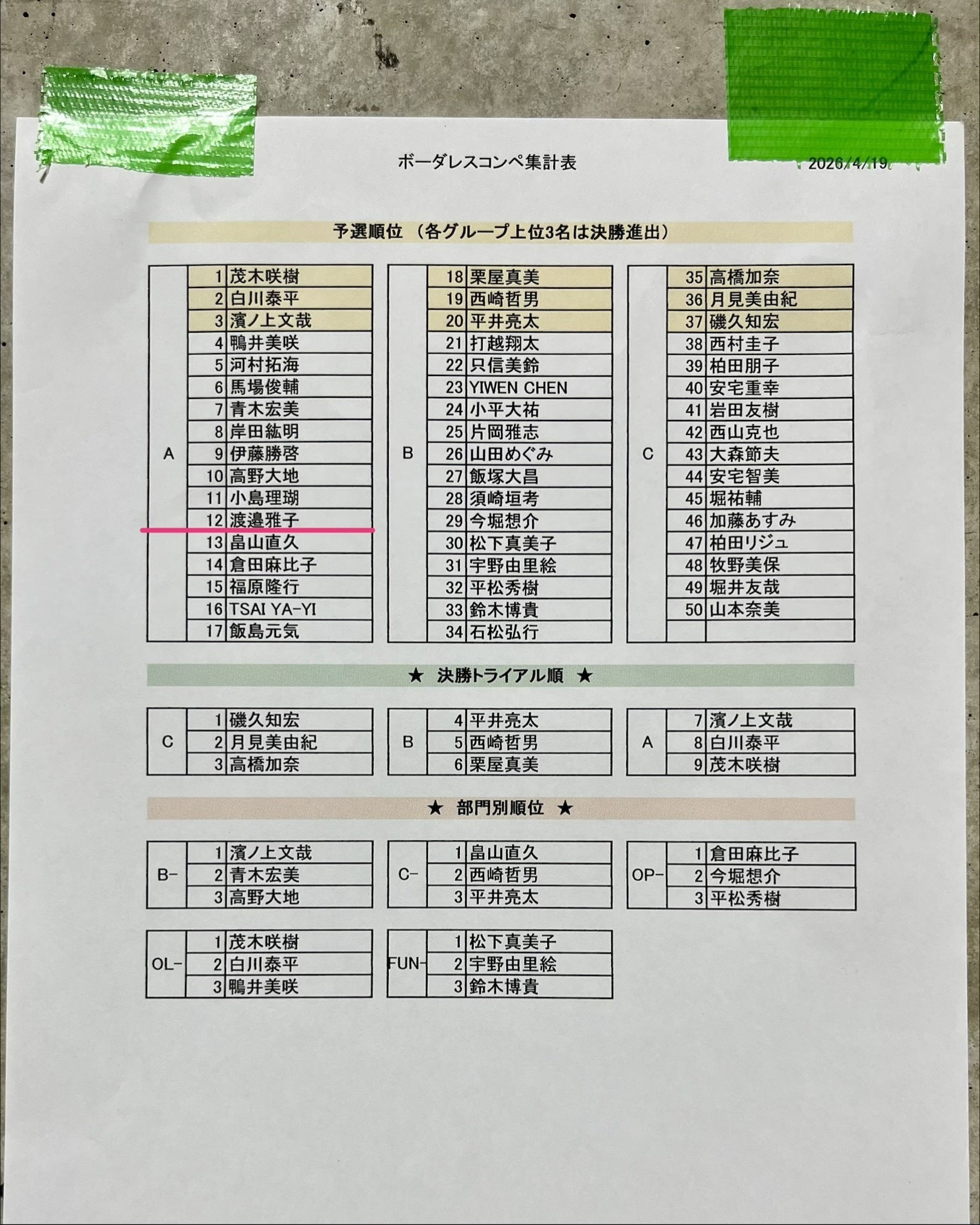 ガチ片脚は私1人だったけど、片脚クライミング体験を選んだ人は11人もいて、その動きからたくさん学べた。公式大会に近い規模のルートを登れて、今できるようになった点と今後できるようにする点を確認できた。このイベントを力に変えて、来月から国際大会がんばる。