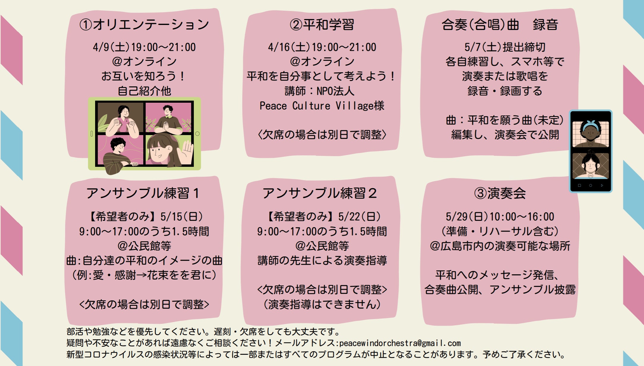 オリエンテーション、平和学習、演奏会(後援:広島市)で構成されます。