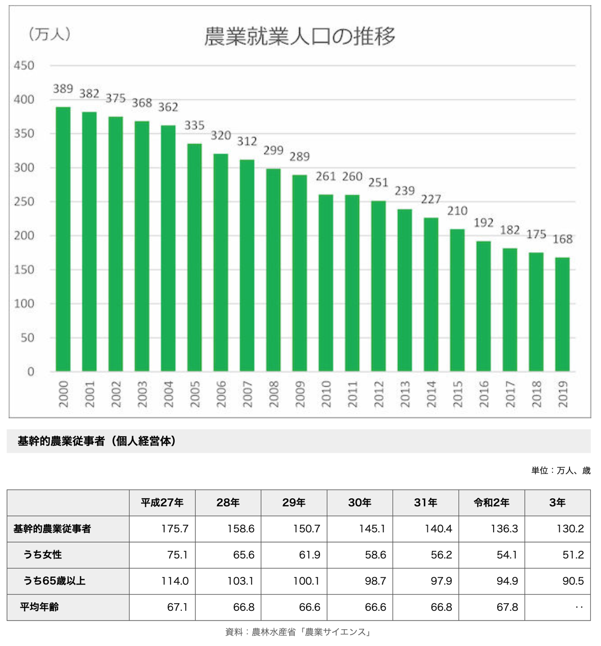農業に従事する者の平均年齢は、なんと約70歳!!新規就農者が少ないことは、国の問題にもなっています。