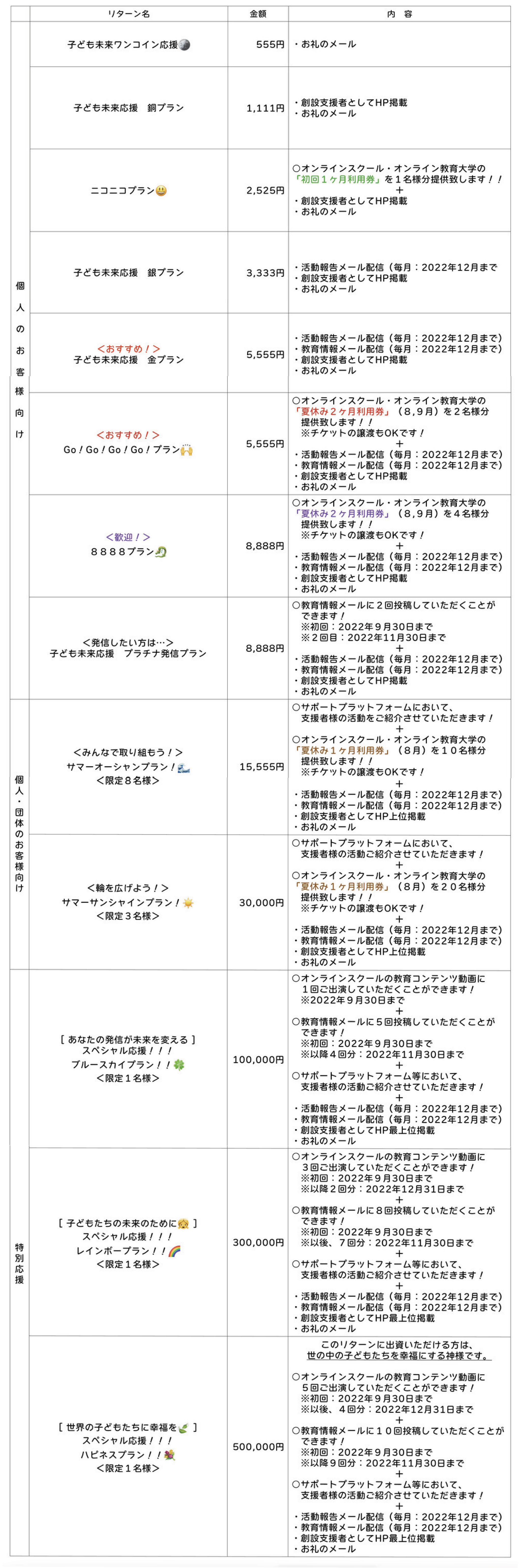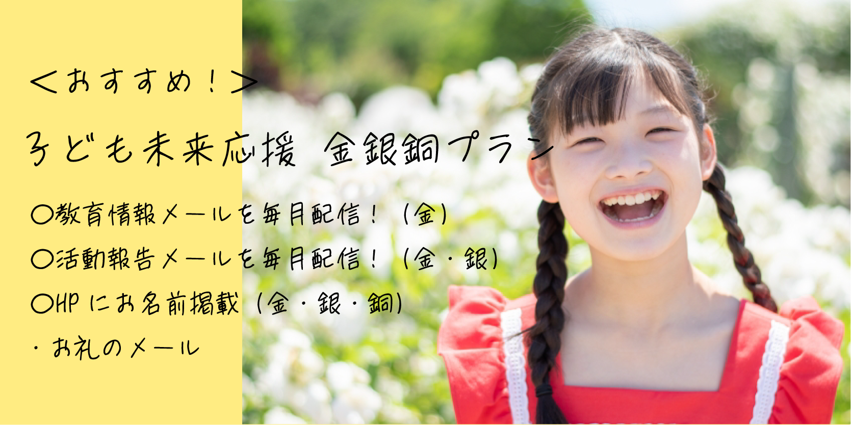 ※なお、こちらのプランには、教育情報メールへの投稿券(2回分)がついてくる「子ども未来応援 プラチナ発信プラン(8,888円)」も御座います。詳細につきましては、リターン一覧でご確認ください。