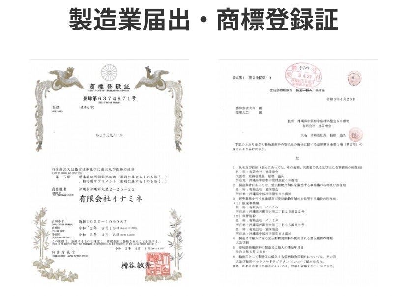 独自で開発したオリジナルの木酢含有液(特許第4718198)を飼料に数%添加することで、獣特有の生臭さを減少し、肌の艶が良くなる、脂肪が減る等が試験結果から分かっており、この飼料設計技術を取り入れ製品化に成功した。 添加剤として、これも独自の飼料設計技術の精製方法で泡盛粕を粉末化した動物用添加剤 (特願 2020-215805)をブレンドする事で臭いの減少をサポートし、助勢剤として竹炭、木炭、ゼオライト等の配合、そして腸内環境に良いとされる酵母、乳酸菌等をベストブレンドし、腸内環境のバランスを整え、動物達が持っている強い免疫力の維持をサポートするペットフードサプリメントです。