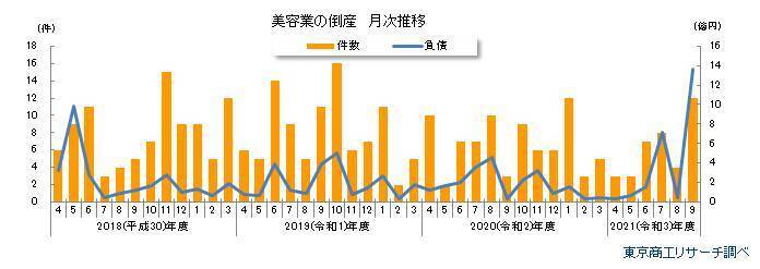 又、 9月は最も高く、12件の倒産件数があり、前年同月の4倍に急増しています。12件のうち半数の6件が新型コロナウイルス関連の倒産であり、8月から9月にかけての第5波の感染拡大による「美容室控え」が影響しているようです。*東京商工リサーチ引用