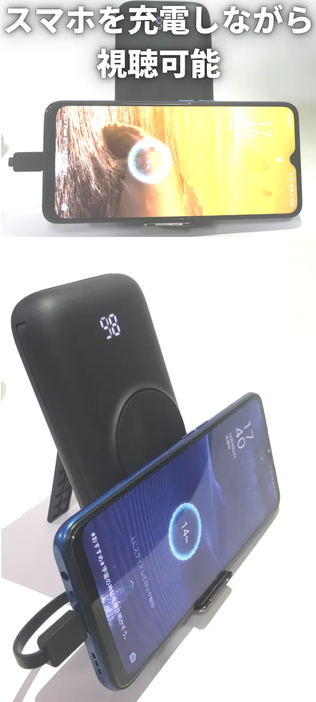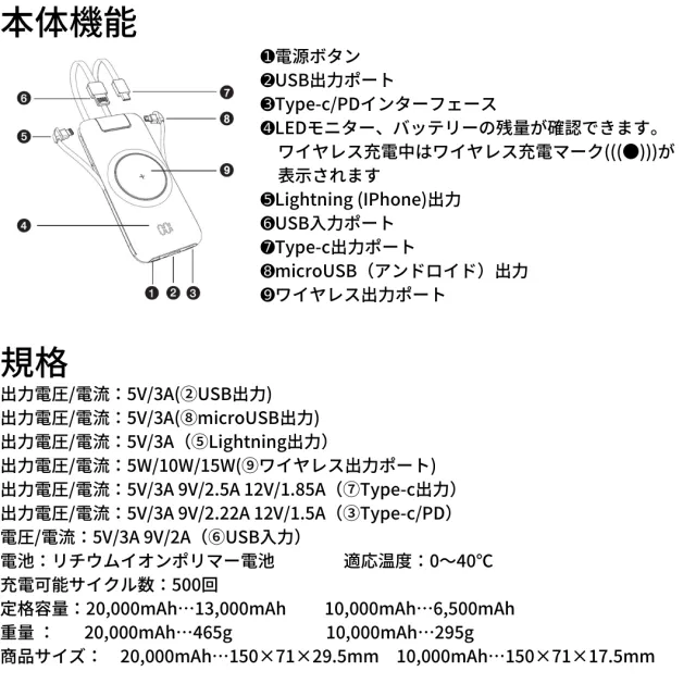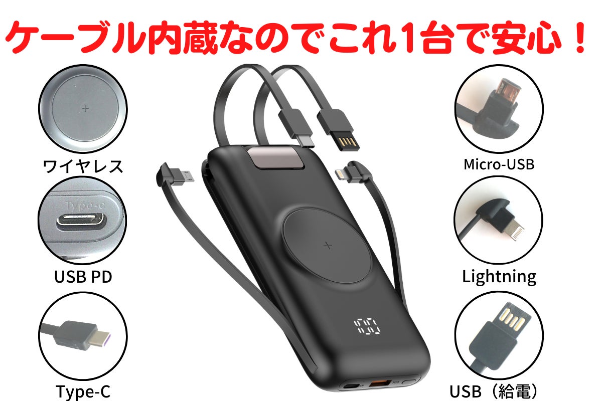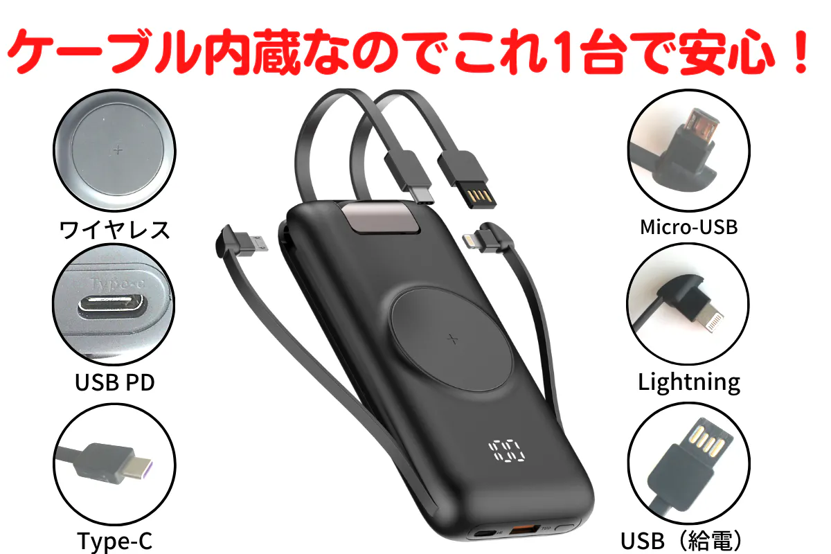 ※ワイヤレス充電、Micro-USB、USB PD(パソコンへの充電)、Lightning、Type-C、市販のデバイスほぼ全てに対応できます。