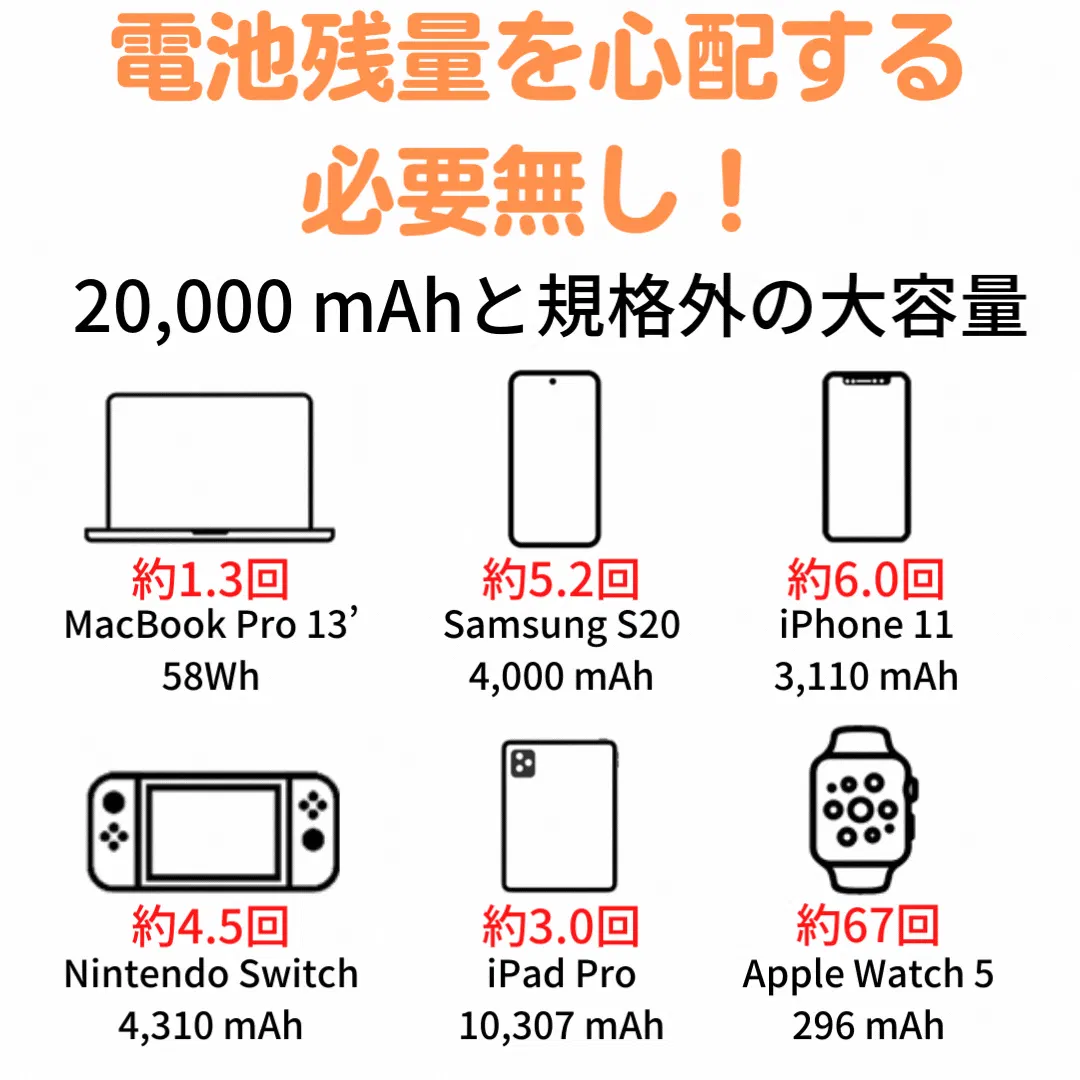 iPhone11を6回、iPadを3回フル充電できるため、少し遠出の旅行でもモバイルタンカーがあれば充電切れの心配はありません!