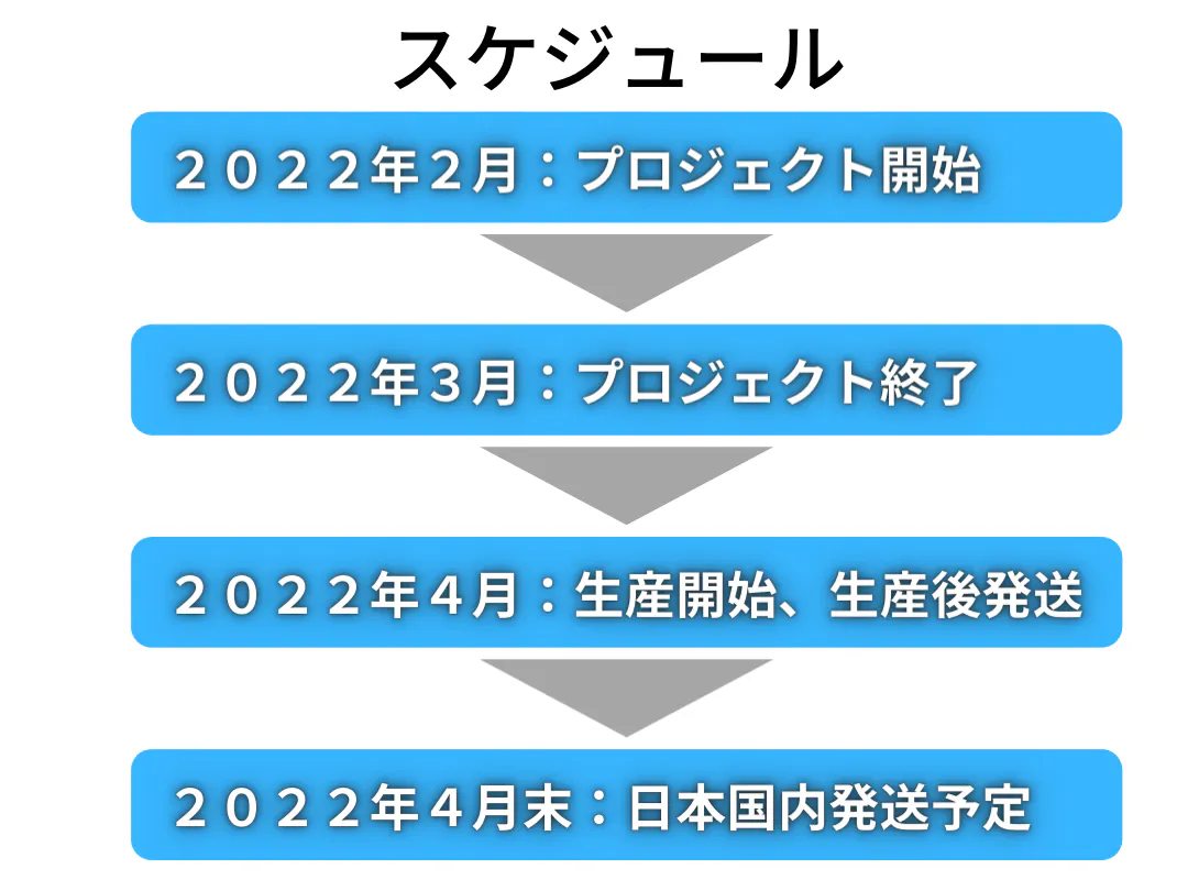 ・配送時期: リターン詳細に記載の通り、4月末までの配送を予定しております。但し、生産状況や中国からの輸送状況によって遅れが生じる場合がありますのでその際は当プロジェクトページ内の「活動報告」または購入者へのメッセージ等でご連絡します。