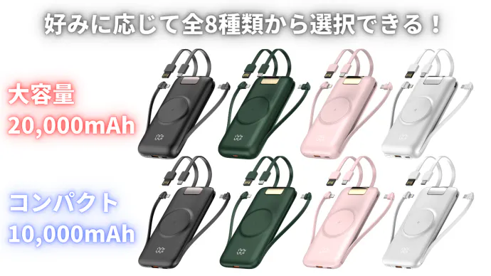 大容量タイプは20,000mAhあり充電切れの心配が軽減されます。コンパクトタイプは10,000mAhの容量を維持しつつ、持ち運びやすい重さです。