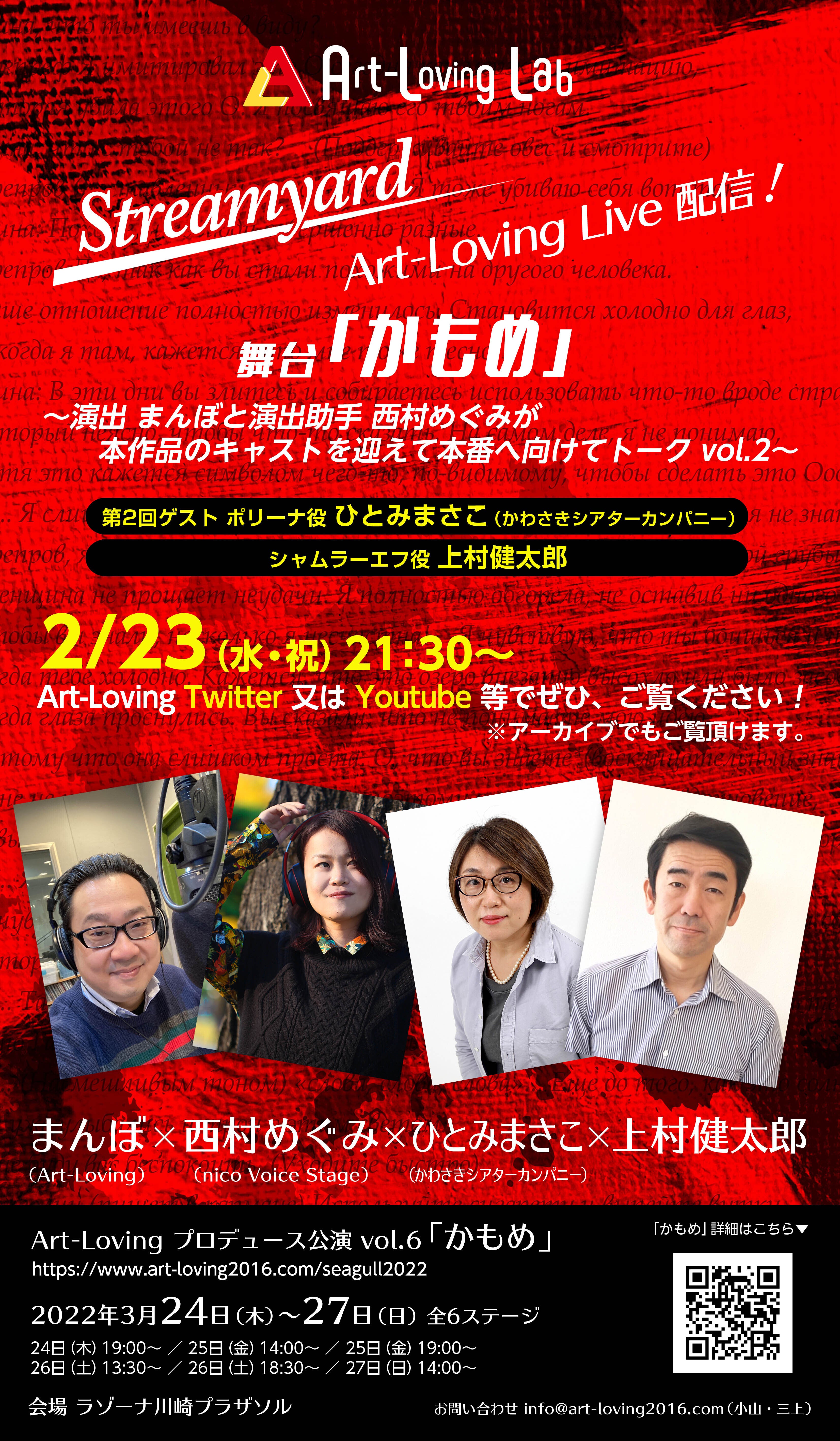 Art-Lovingが定期的に配信している、ライブ配信「Art-Loving Lab」にて本公演「かもめ」のキャストをゲストに迎えて、稽古中のエピソードや2年越しで上演する作品への思いなど、トークを繰り広げています。Youtubeにてご覧いただけます。Art-Lovingプロデュース公演Vol.6「かもめ」クラウドファンディングご協力のお願いhttps://youtu.be/5yNrcAjenLAArt-Loving Lab #11「舞台「かもめ」~出演キャストを迎えてのトーク Vol.1ゲスト:三木美毅(ソーリン役)https://youtu.be/R26Zj2akZn8Art-Loving Lab #12「舞台「かもめ」~出演キャストを迎えてのトーク Vol.2ゲスト:ひとみまさこ(ポリーナ役)、上村健太郎(シャムラーエフ役)https://youtu.be/Ot3Bbnkf2CoArt-Loving Lab #13「舞台「かもめ」~出演キャストを迎えてのトーク Vol.3ゲスト:鳥越さやか(アルカージナ役)https://youtu.be/yFa7gPq4i-MArt-Loving Lab #14「舞台「かもめ」~出演キャストを迎えてのトーク Vol.4ゲスト:佐山 尚(トレープレフ役)https://youtu.be/KJWigFurdd0Art-Loving Lab #15「舞台「かもめ」~出演キャストを迎えてのトーク Vol.5ゲスト:小林英樹(メドヴェージェンコ役)、西村めぐみ(マーシャ役)https://youtu.be/QDGLDKSEoREArt-Loving Lab #16「舞台「かもめ」~出演キャストを迎えてのトーク Vol.6ゲスト:梶原 航(トリゴーリン役)https://youtu.be/QdkI_wo8cX4Art-Loving Lab #17「舞台「かもめ」~出演キャストを迎えてのトーク Vol.7ゲスト:瑞生 桜子(ニーナ役)https://youtu.be/aCkREh2Kp2c