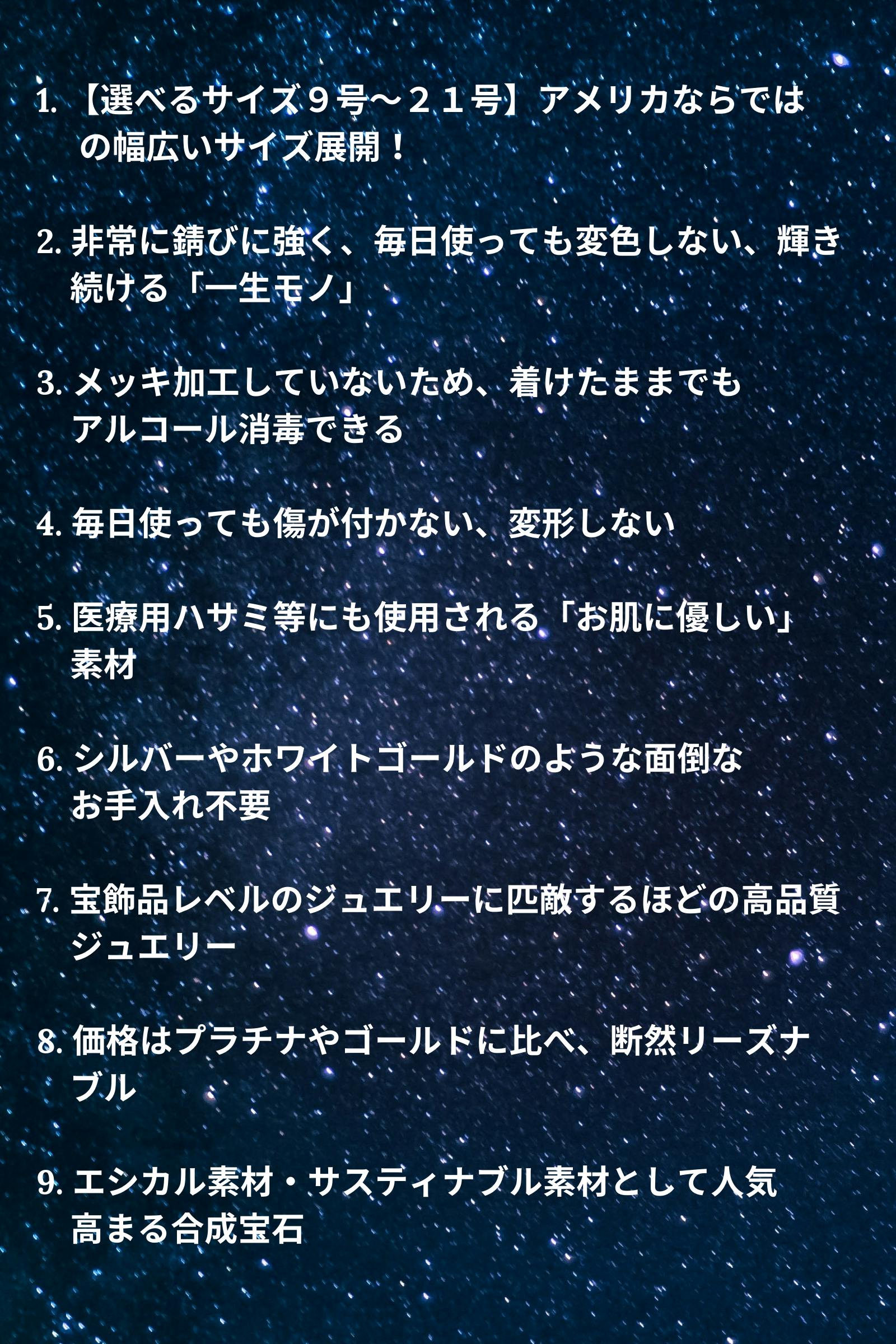 医療用器具にも使われる、お肌に優しい新素材を使用。アルコール消毒、傷や汗に強く、丈夫で変色や変形しにくく、面倒なお手入れ不要で輝き続ける究極のリングが誕生!有名インターナショナルブランドと同じ、アメリカのメーカー企業とタッグを組み、高品質で【リングサイズ約9~21号】と幅広いサイズ展開。