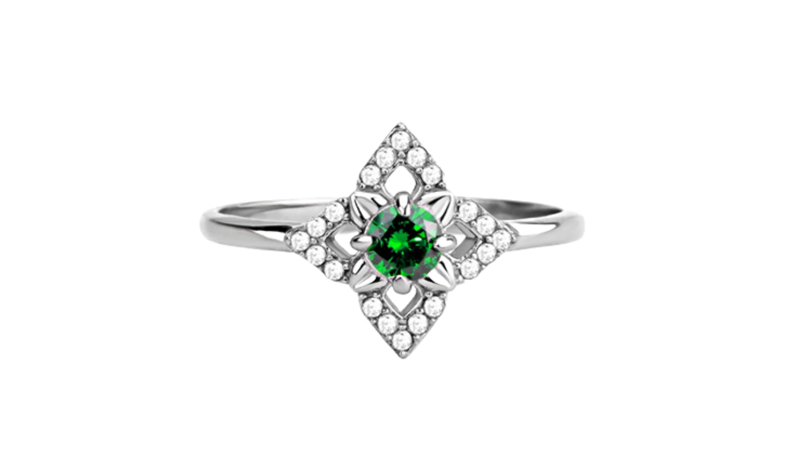 ラウンドブリリアントカットを施したエメラルドグリーンカラーのセンターストーンが印象的。