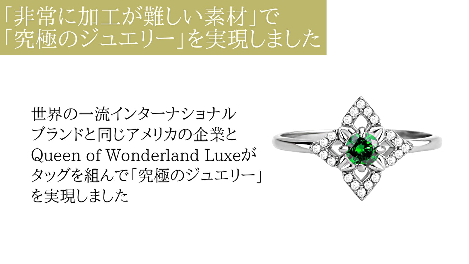 そこで今回、世界の一流インターナショナルブランドと同じアメリカのメーカー企業とQueen of Wonderland Luxeがタッグを組んで、非常に難しい素材であるサージカルステンレス・SUS316で「ファインジュエリー 」と呼ばれるレベルのジュエリーに匹敵するほどの、芸術性の高い“アートなジュエリー“を実現しました!