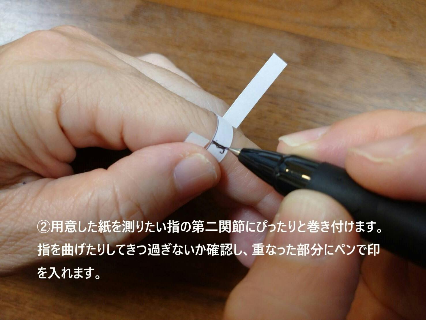 ②用意した紙を測りたい指の第二関節にぴったりと巻き付けます。