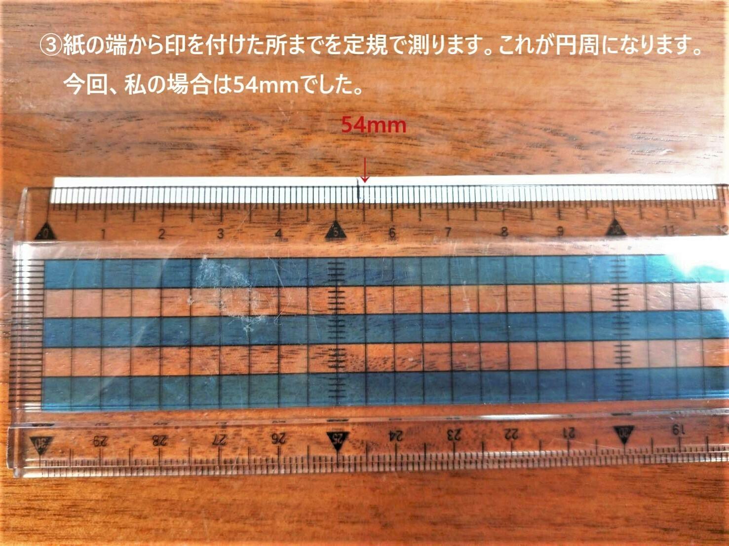 ③紙の端からペンで印を付けた所までを定規で測ります。これが円周になります。