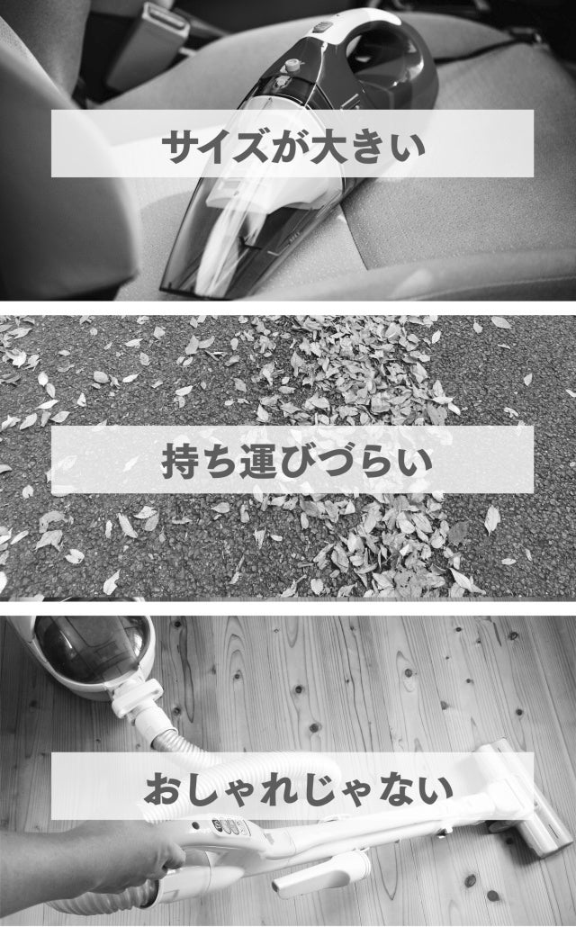 部屋の机や隅、車内の床や座席など、大きな掃除機を必要としないシーンにおいて、大きくてかさばる…持ち運びができない…部屋に置いてると見栄えが悪い…