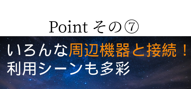 Bluetoothやヘッドホン、パソコンといった周辺機器と接続ができるため可能性は無限大。ビジネスミーティングやゲームなど、さまざまな利用シーンに活用できます。
