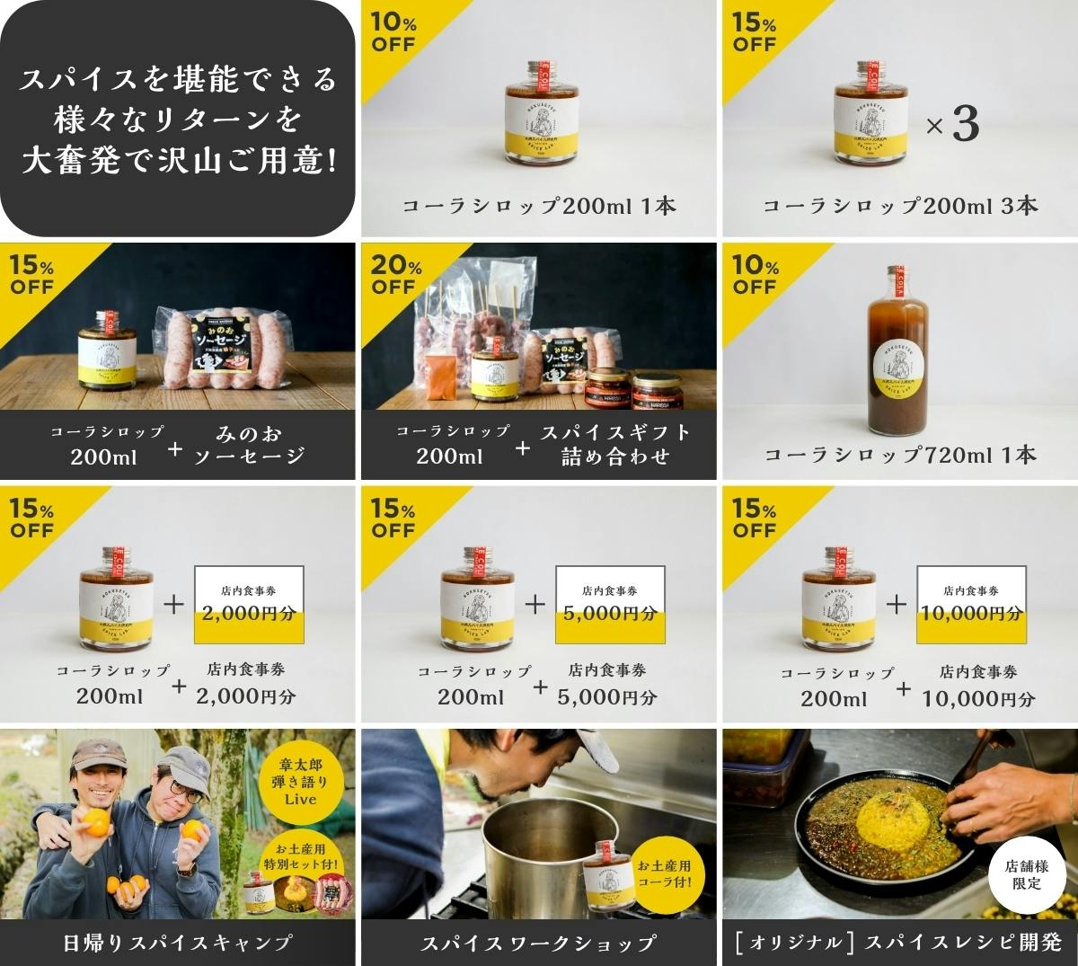 今回のリターンは完成したスパイスコーラのお届けの他、北摂スパイス研究所のスパイスおつまみ、ワークショップ、イベント参加権など、大奮発でたくさんご用意をさせていただきました!