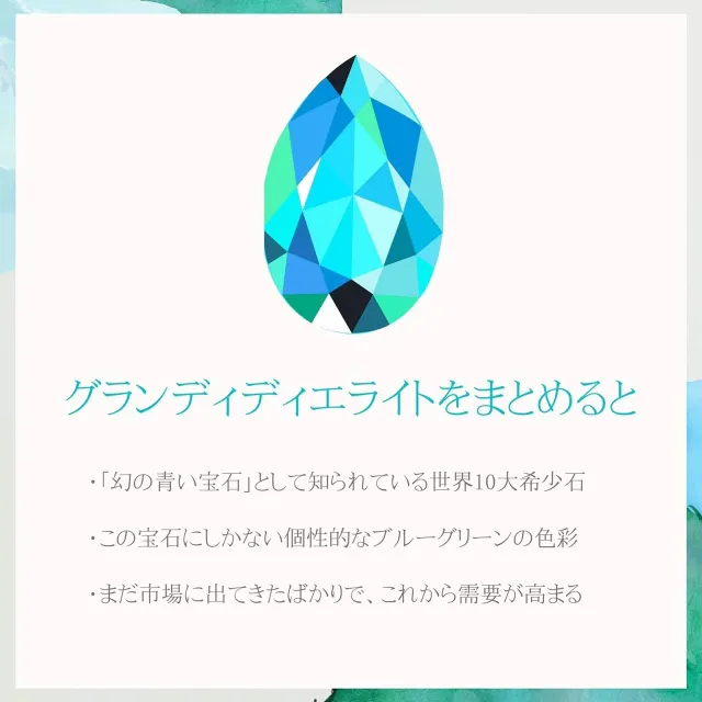 グランディディエライトは、希少というだけではなく、エメラルドのようなグリーンでもなく、サファイアのようなブルーでもない、グリーンとブルーの中間色のような、とて美しい見た目をしています。