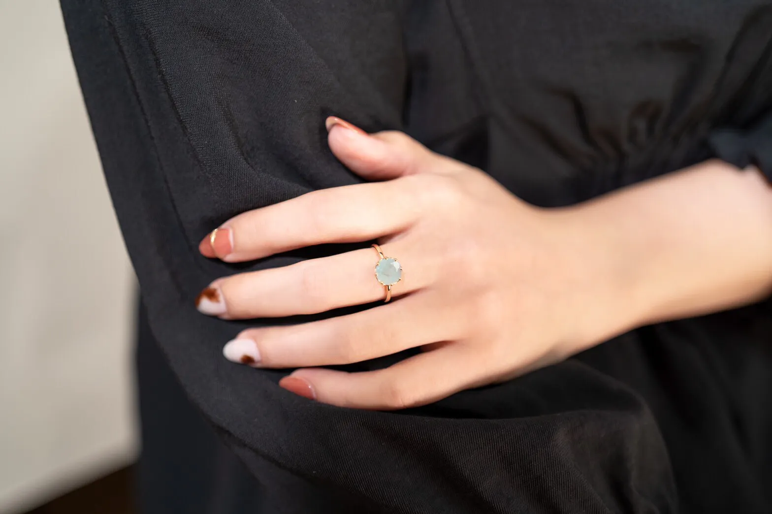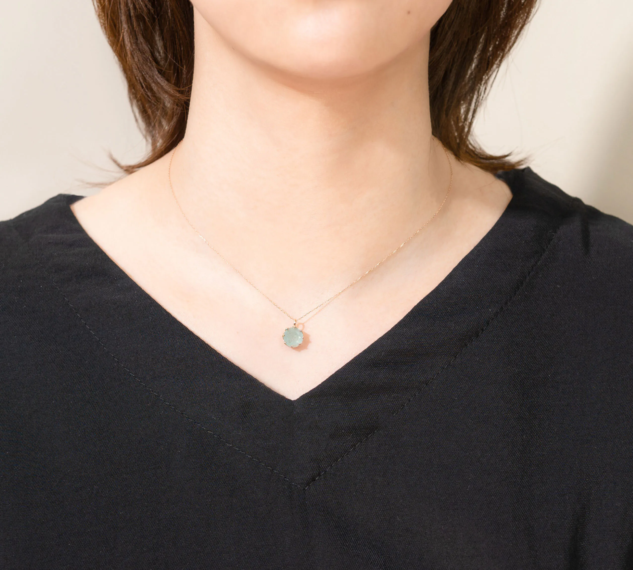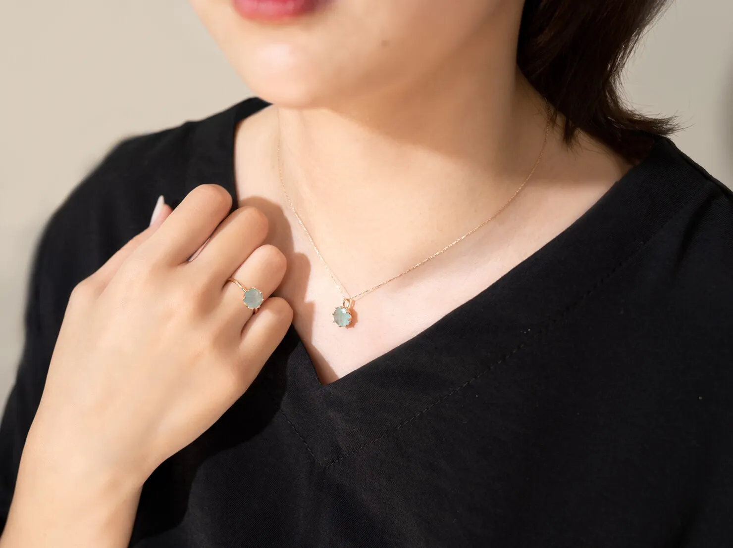 定番のルビーやエメラルドのような、クッキリしたカラーの宝石にはない、ニュアンスブルーグリーンの色合いが、浮くことなく、希少石ならではの個性的な存在感をはなってくれます。