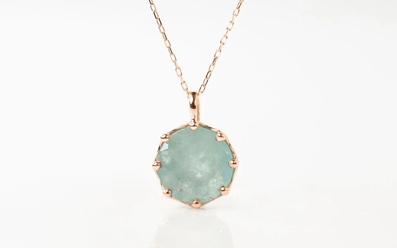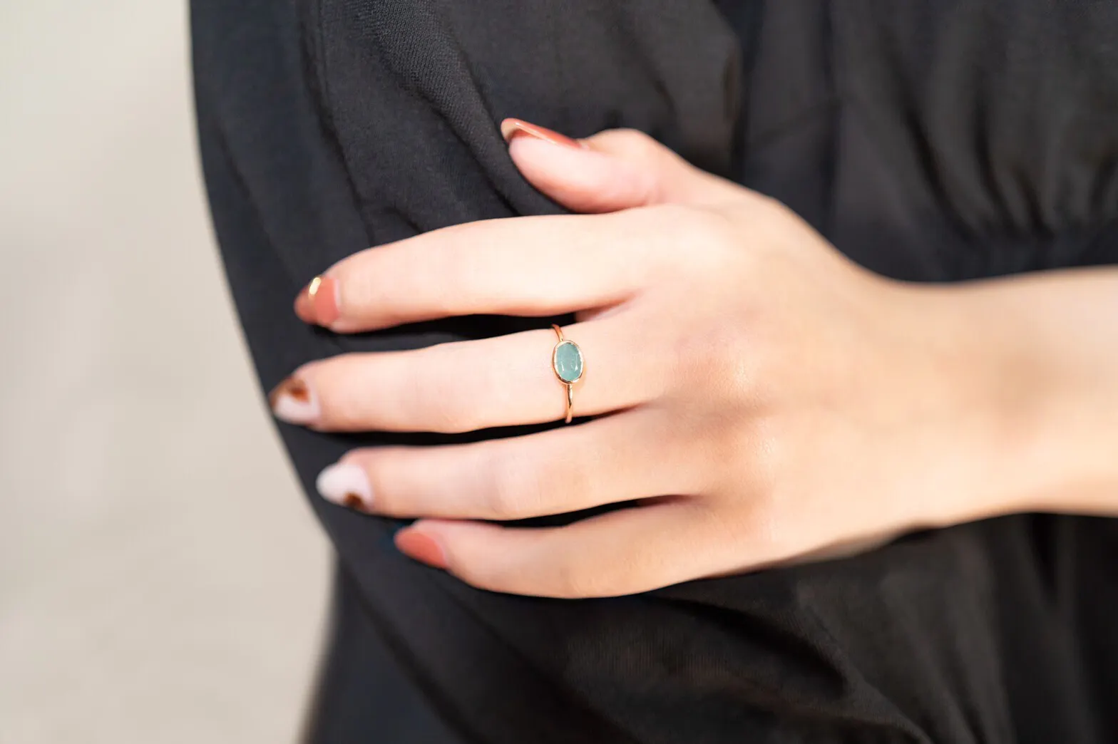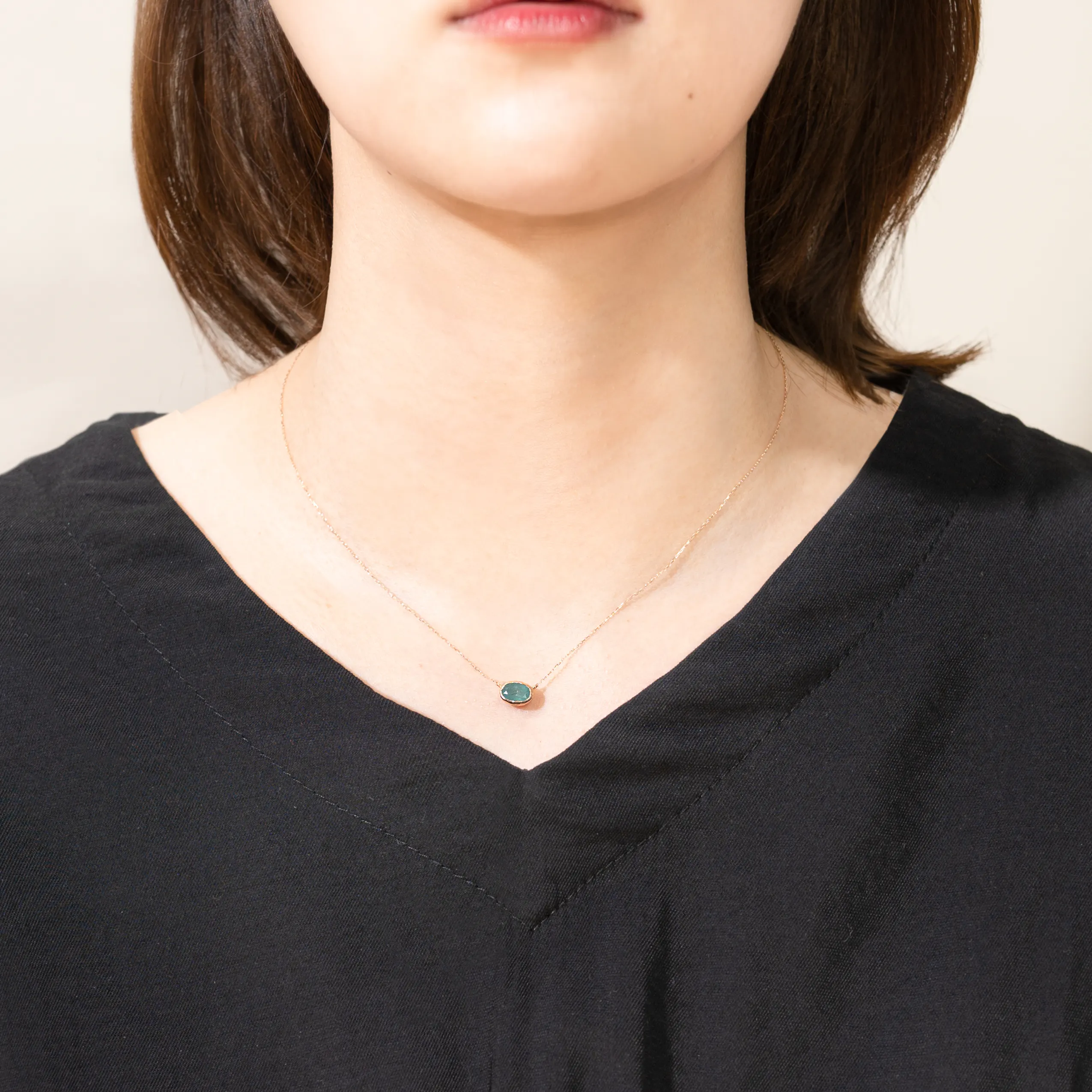 定番のルビーやエメラルドのような、クッキリしたカラーの宝石にはない、ニュアンスブルーグリーンの色合いが、浮くことなく、希少石ならではの個性的な存在感をはなってくれます。