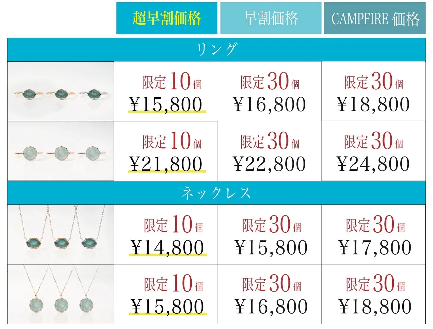 私たちは【シャルムジュエリー】を制作するために、工場とデザイン・仕様を実現できるよう、プロジェクトを誠心誠意進めています。 しかしながら開発中の工程において、デザイン・使用が一部変更になる可能性もございます。製造スケジュールについては、プロジェクト成功を想定した数で調整しておりますが、想定を上回る応援の申し込みがあった場合、製造や発送に伴うやむを得ない事情によりお届けが遅れる場合がございます。上記のようにプロジェクトページに記載している内容に変更がある場合は、活動レポートなどで共有を行っていく予定です。 本文中に記載させていただいたスケジュールは、あくまでプロジェクト公開時点の予定です。応援購入の性質上、配送遅延のおそれがございます。 原則として、配送遅延に伴う応援購入のキャンセルはできませんが、リターン配送予定月から3ヵ月を超えた場合には、希望者に限りキャンセルにて対応させていただきます。
