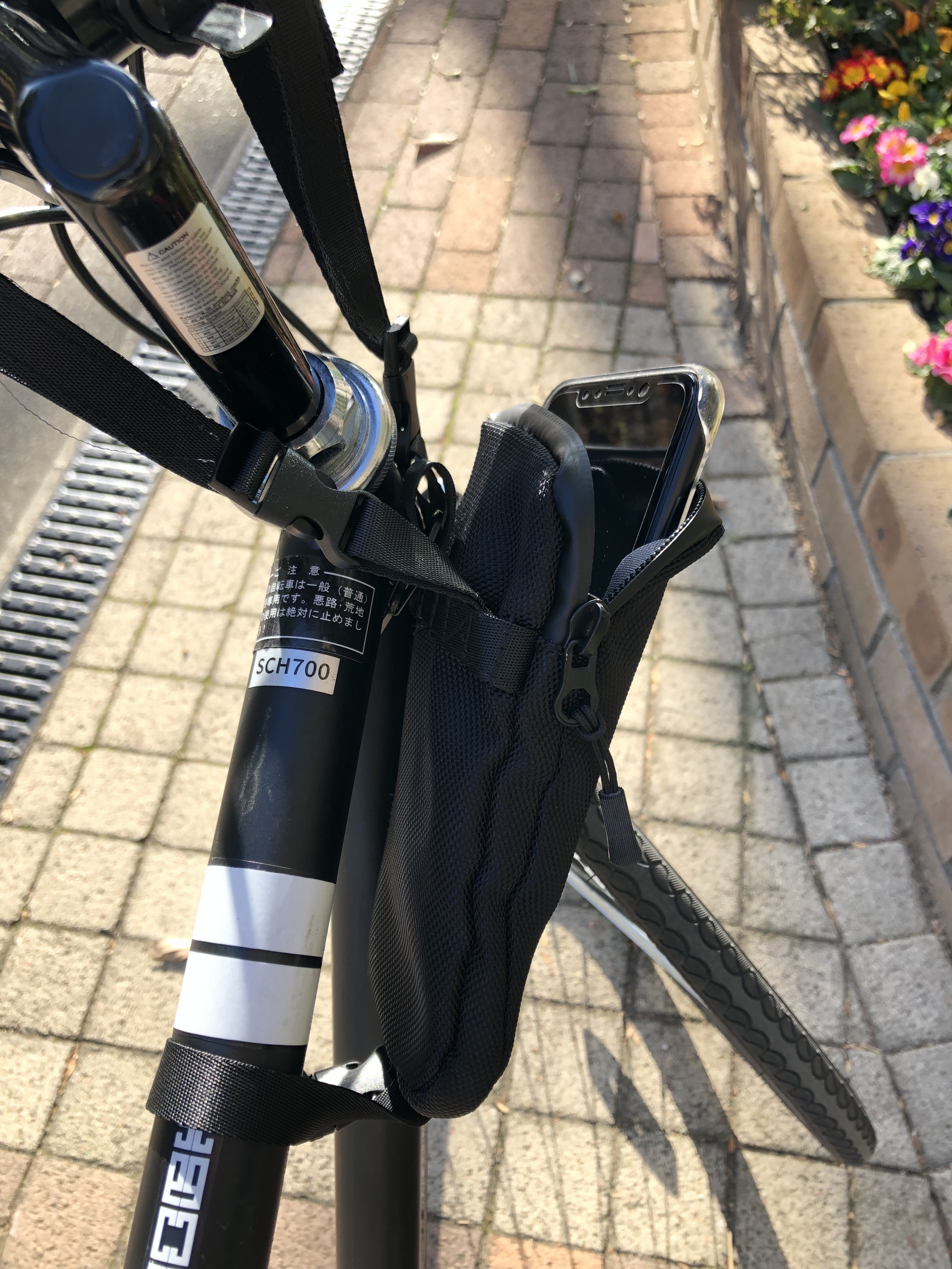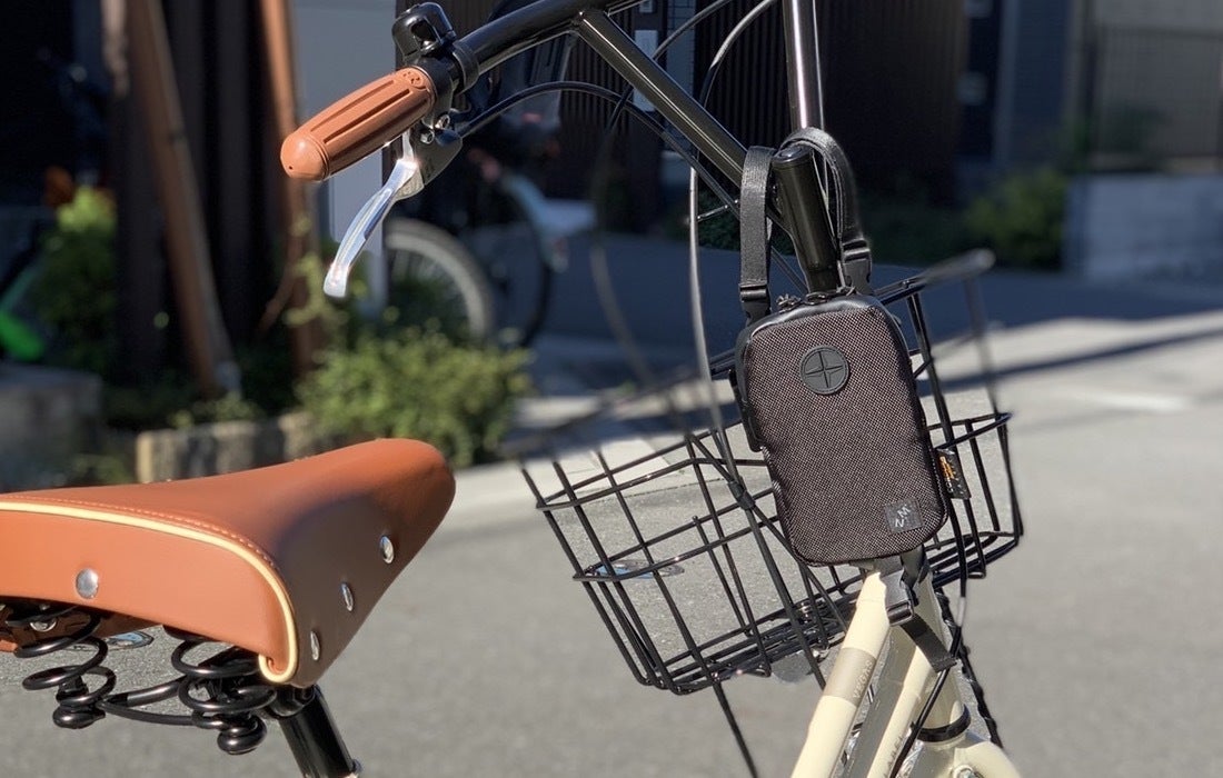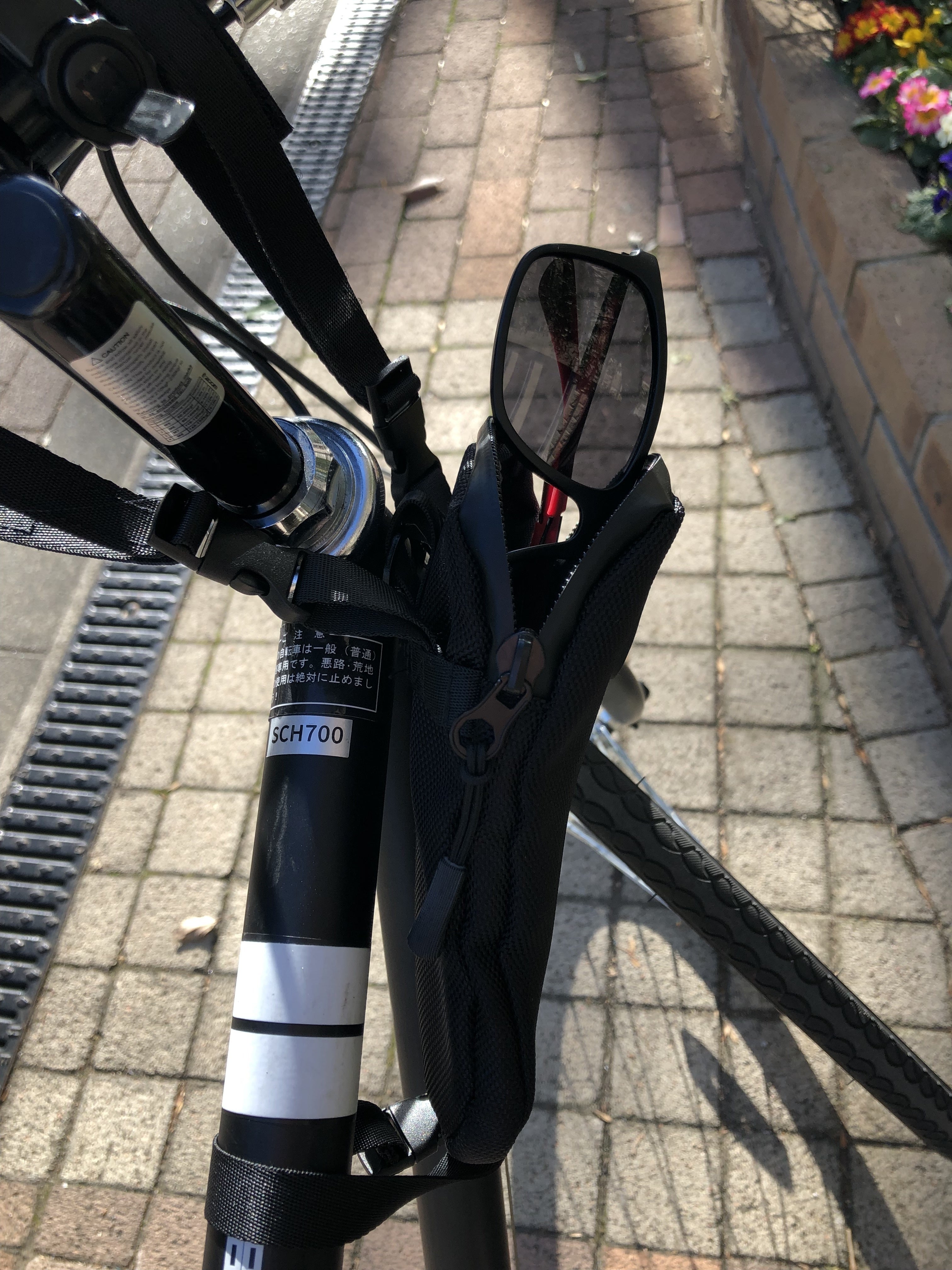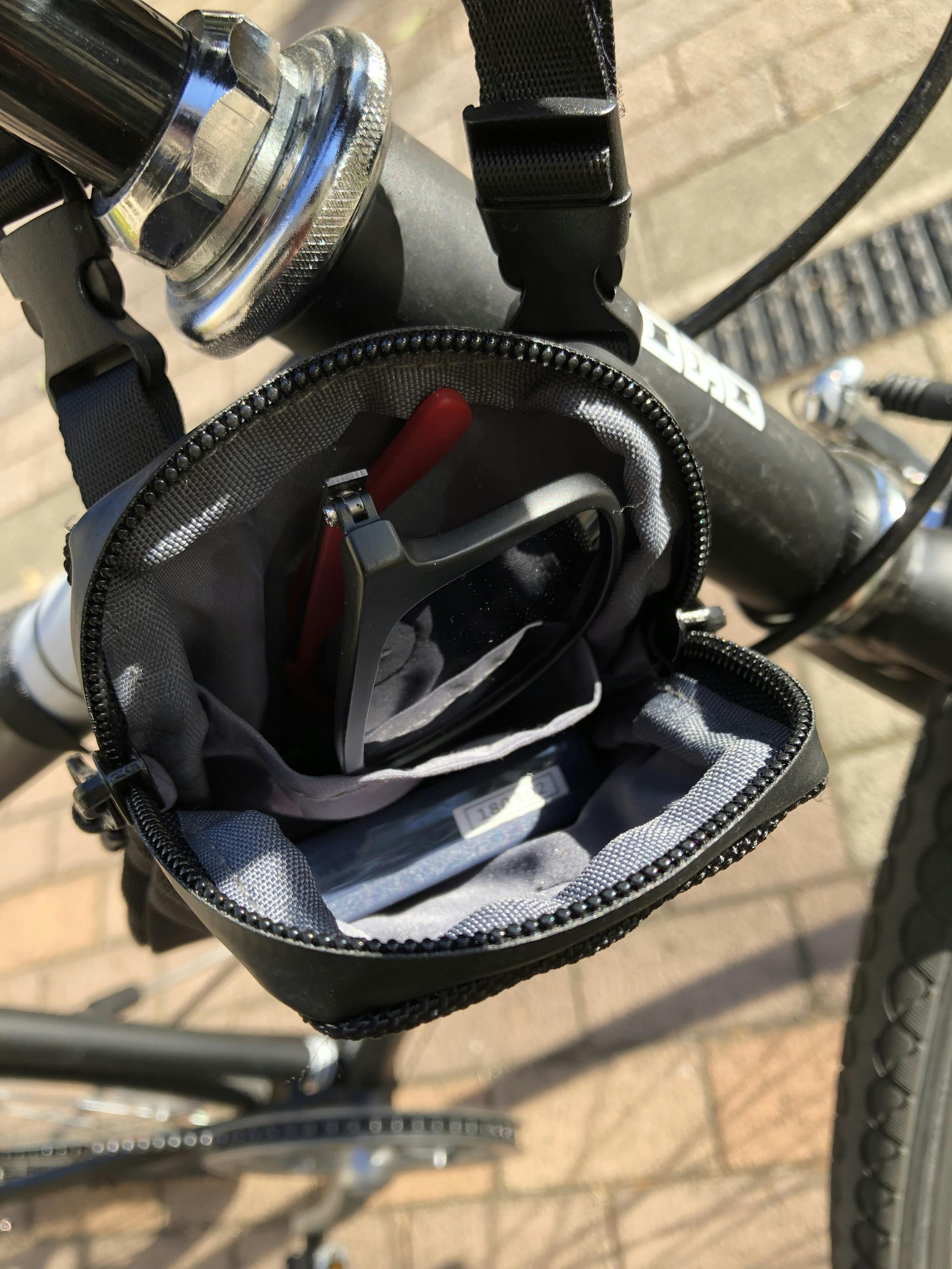 ハンドルに引っ掛け不安定さを固定するために三点で固定。自転車によっては横向きでの固定に。サングラス、小タオル、マスク、小銭などリュックを下ろさずに必要なものを素早く出し入れ。