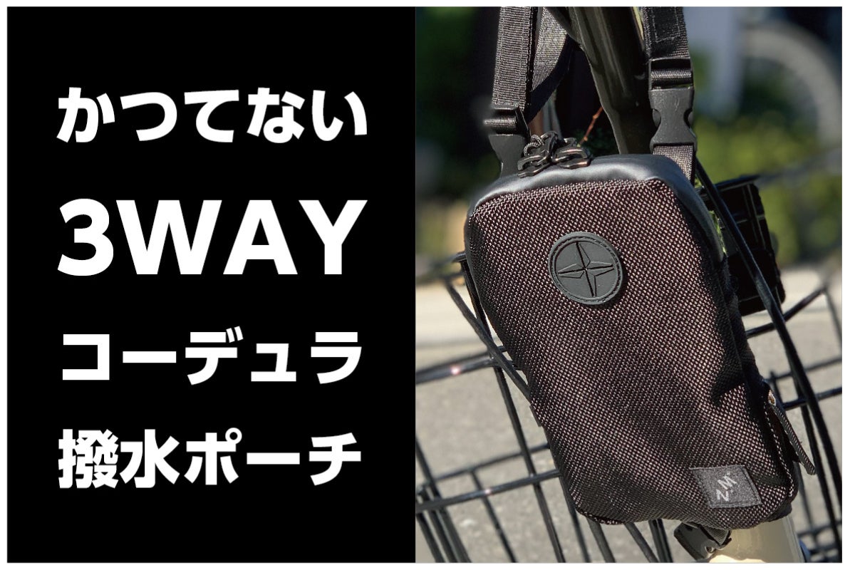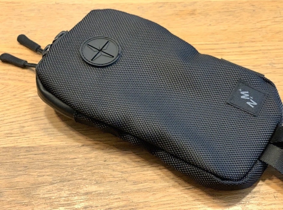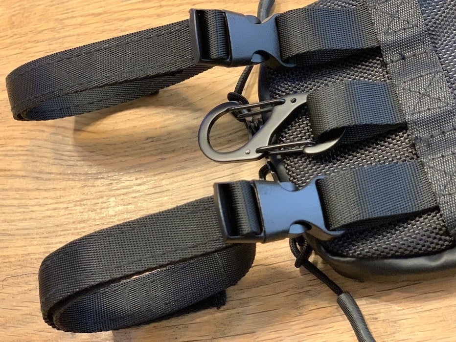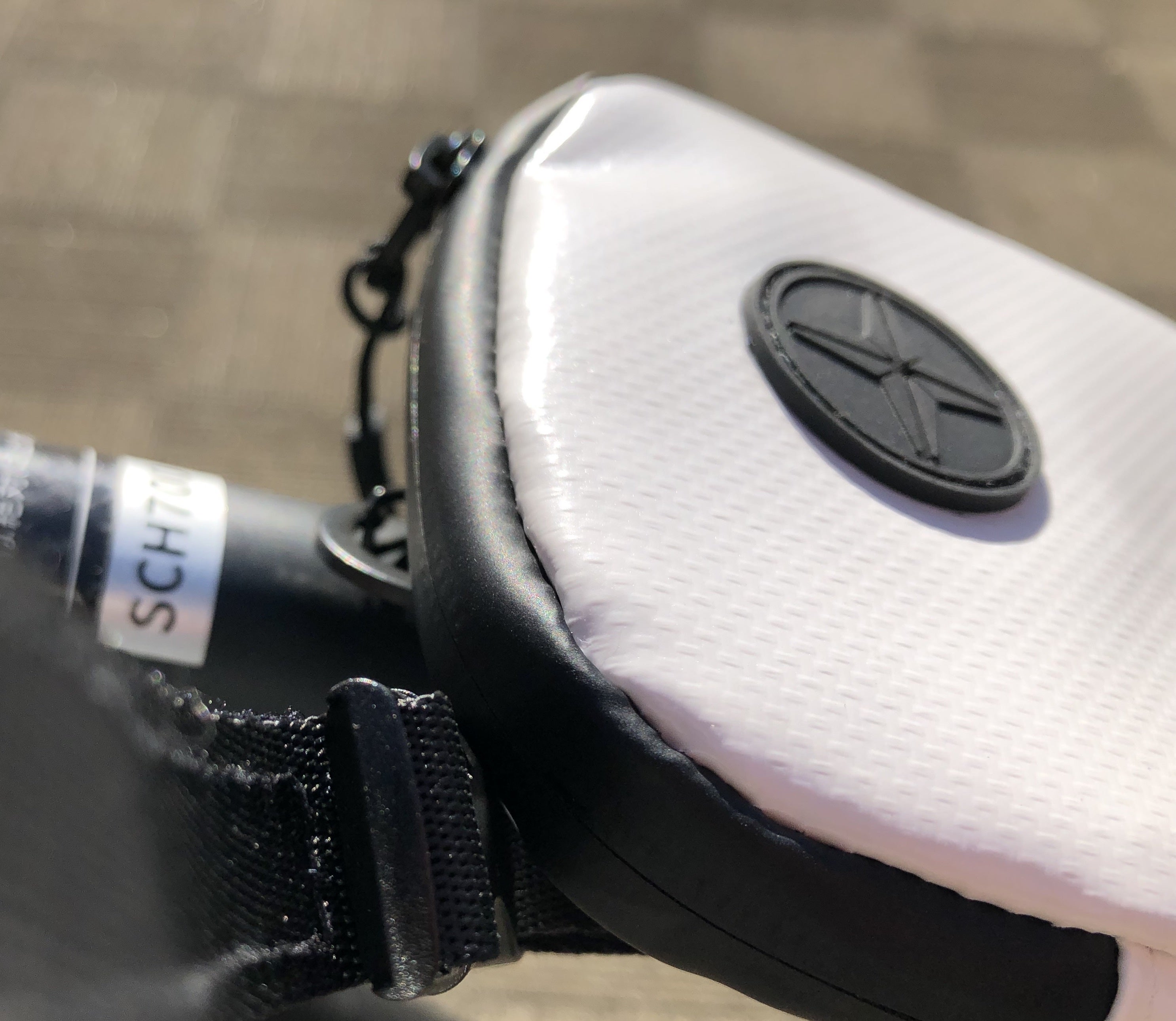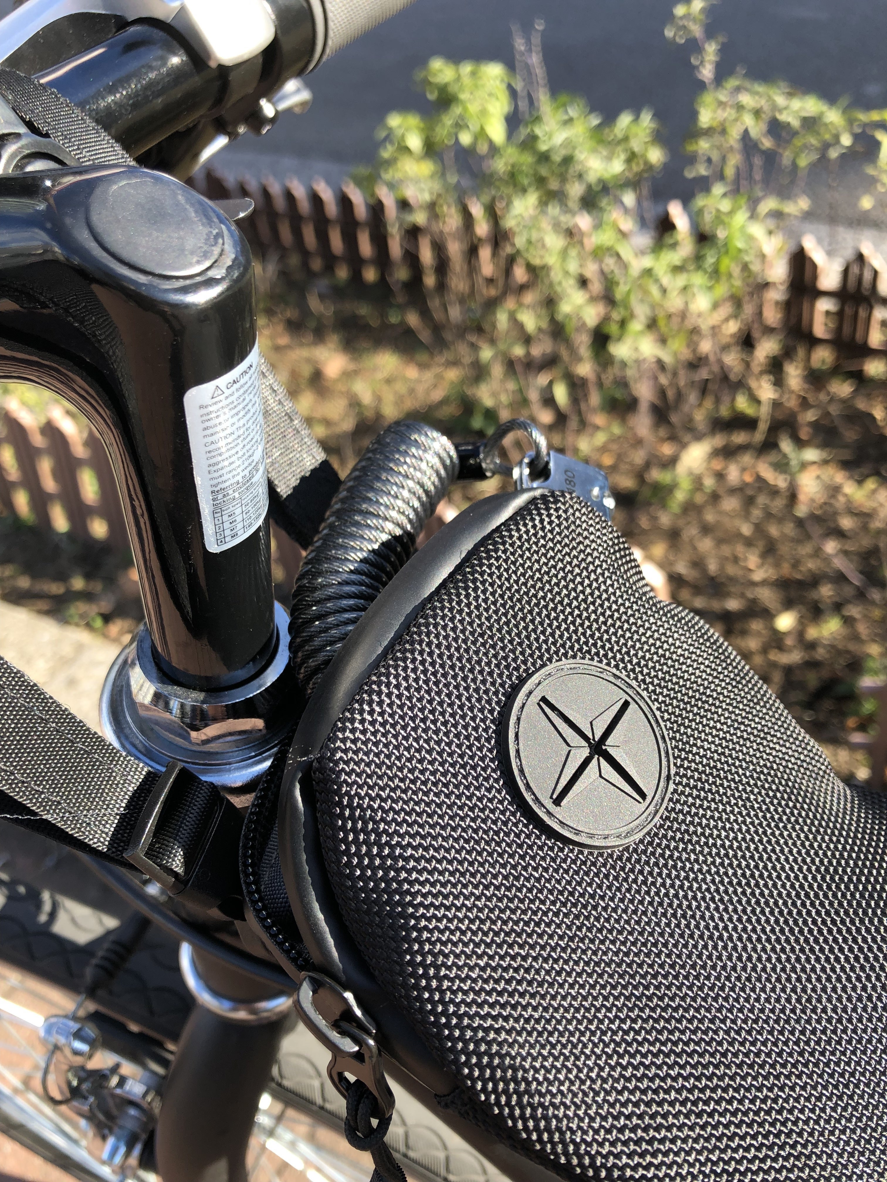 ハンドルに引っ掛け不安定さを固定するために三点で固定。自転車によっては横向きでの固定に。サングラス、小タオル、マスク、小銭などリュックを下ろさずに必要なものを素早く出し入れ。