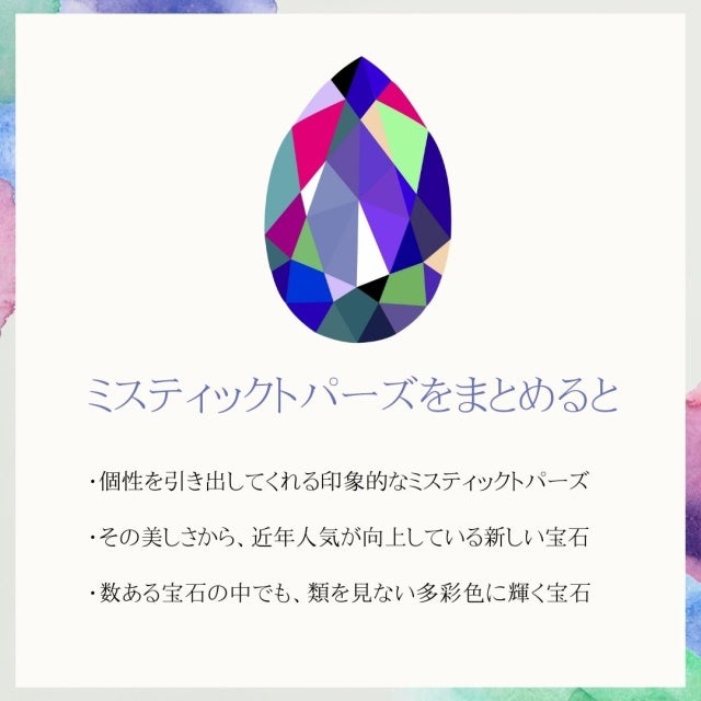 ミスティックトパーズは、1月22日の誕生石とされているほか、石言葉は「魅惑の輝き」とされ、七色に輝くことから、持ち主の才能・個性を引き出してくれるという意味を持つと言われています。
