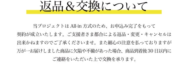 私たちは【シャルムジュエリー】を制作するために、工場とデザイン・仕様を実現できるよう、プロジェクトを誠心誠意進めています。 しかしながら開発中の工程において、デザイン・使用が一部変更になる可能性もございます。製造スケジュールについては、プロジェクト成功を想定した数で調整しておりますが、想定を上回る応援の申し込みがあった場合、製造や発送に伴うやむを得ない事情によりお届けが遅れる場合がございます。上記のようにプロジェクトページに記載している内容に変更がある場合は、活動レポートなどで共有を行っていく予定です。 本文中に記載させていただいたスケジュールは、あくまでプロジェクト公開時点の予定です。応援購入の性質上、配送遅延のおそれがございます。 原則として、配送遅延に伴う応援購入のキャンセルはできませんが、リターン配送予定月から3ヵ月を超えた場合には、希望者に限りキャンセルにて対応させていただきます。