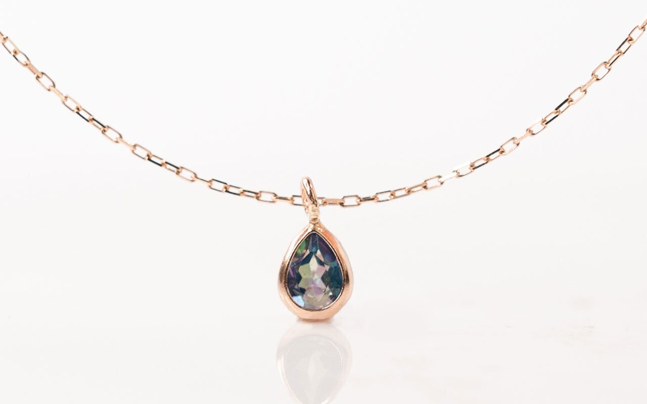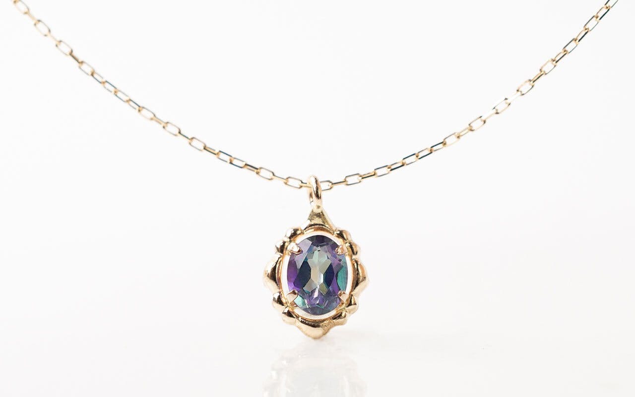 そんな時に、見るたびに様々な表情を見せてくれるミスティックトパーズは、小さいものでもとても美しく、そのきらめきが胸元にひとつあるだけでも、静かに周りの目を引くことができます。