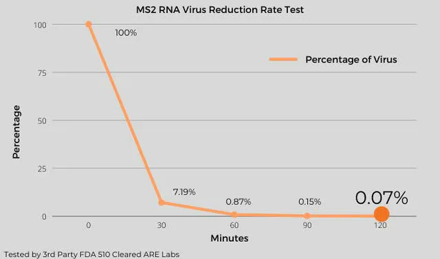 米国FDA(米国食品医薬品局)認可の研究室によるウイルス実験レポートでは16㎥のチャンバー(ウイルスが外部にもれないように密閉された実験室)で、インフルエンザやライノウイルスなど多数の呼吸器ウイルスの代わりとして使われている、エアロゾル化したMS2バクテリオファージを使った実験では、240分で98.24%減少。