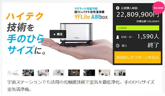 2026/03/17 11:27支援者の皆様ご無沙汰しております。 【AIR6+】プロジェクトチームです。このたび、AIR6+と同じYFLifeの空気清浄機シリーズより、待望の新プロジェクトを開始いたしました。「待望の新色。宇宙ステーション技術×フィルター不要の空気清浄機 AIRbox G2」▼詳細はこちらhttps://camp-fire.jp/projects/930152【AIRbox G2】は、日本のみならず全世界のクラウドファンディングで数々の実績を上げてきたYFLife(ワイエフライフ)の超小型空気清浄機です。シリーズ累計4,599万円超のクラウドファンディングでのご支援をいただいている人気シリーズの傑作です。宇宙ステーションの浄化技術を応用した、YFLife独自の光触媒技術を搭載。 手のひらサイズながら強力なファンで空気を吸い込み、微細な粒子をしっかりと分解します。最大の特徴は「フィルター交換が不要」であること。 フィルターはたまに水洗いするだけで繰り返し使用でき、面倒な交換作業やランニングコストがかかりません。今回は、皆様からのご要望にお応えし、インテリアやファッションに合わせて選べる「新色」がついに登場しました。私たちは、「空気清浄機を持ち運ぶ」という新たなライフスタイルをご提案したいという想いから、小型かつ高性能な空気清浄機をご紹介しております。お得な早割もご用意しておりますので、ぜひ一度ページをご覧ください。もし、ご興味がございましたら、ご支援いただけますと幸いです。 もっと見る