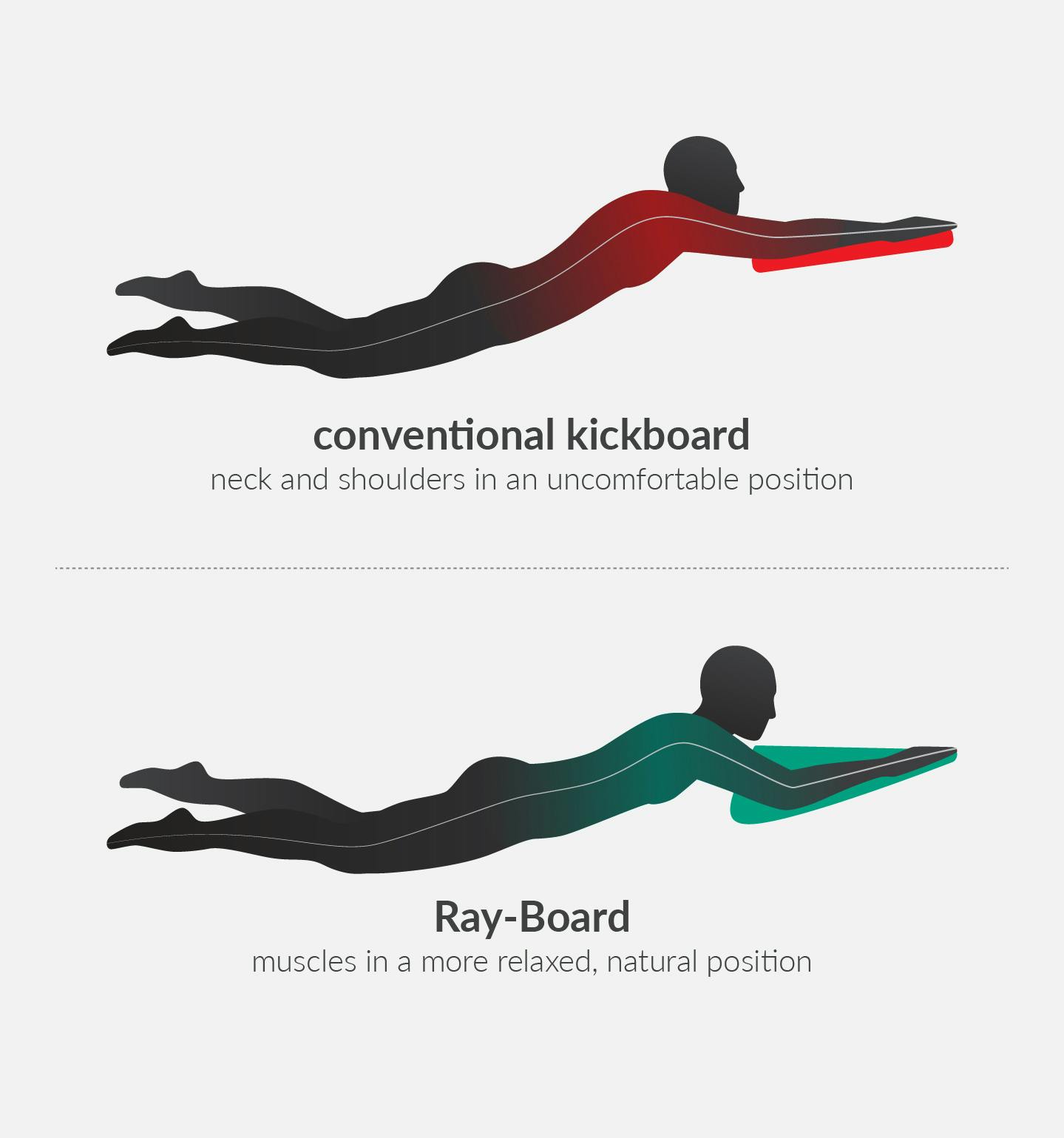 Rayboardは水中姿勢ストリームラインを楽な姿勢にし腰痛リスクを軽減する事も一つの目的として開発されています。