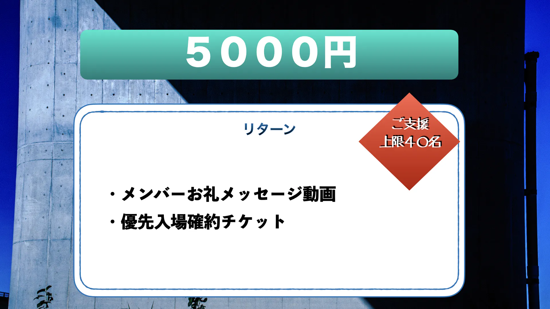 以上のことを踏まえ、リターンの中に含まれている「優先入場確約チケット」の上限数は、各会場のキャパシティに対してほぼ半分の人数になるよう各公演ごとに調整しています。