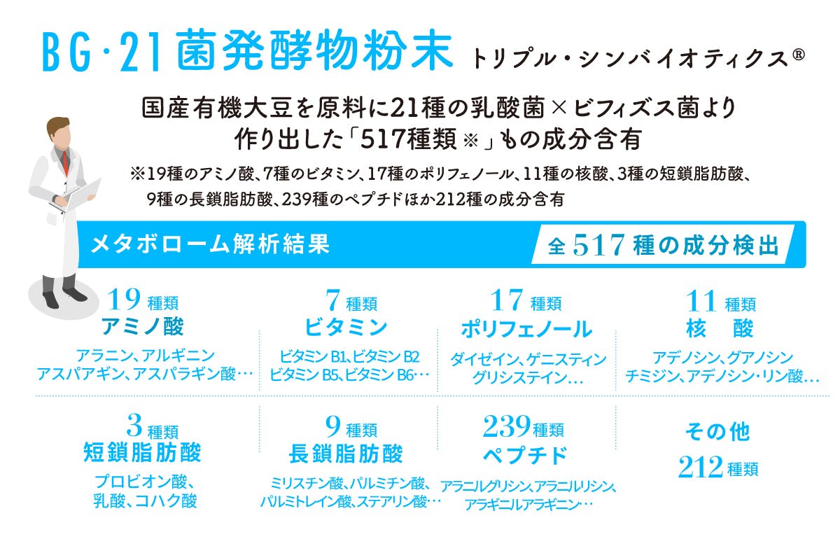 国産有機大豆※1 を原料(培地)に、厳選した乳酸菌•ビフィズス菌(21 種 • 21 株)を共棲発酵することで得られた、乳酸菌発酵原液をメインに、共棲発酵で用いた菌と培地を全て使用したトリプルシンバイオティクス®(プロバイオティクス • プレバイオティクス • バイオジェニックス)原料です。