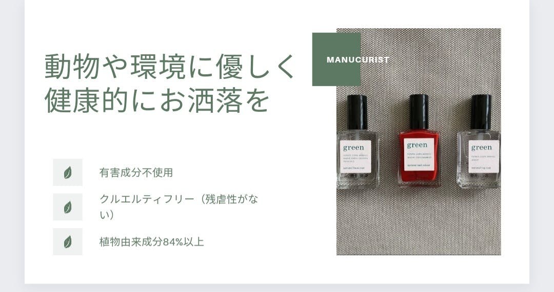 最近のマニキュアは、動物実験をしてない自然由来のものも多く、爪はもちろん、動物や地球を傷つけることなくおしゃれを楽しめます。