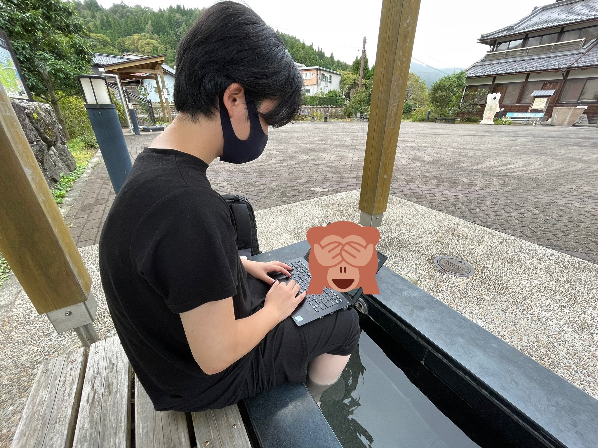 湯村温泉薬師湯前の足湯にてリモートワーク