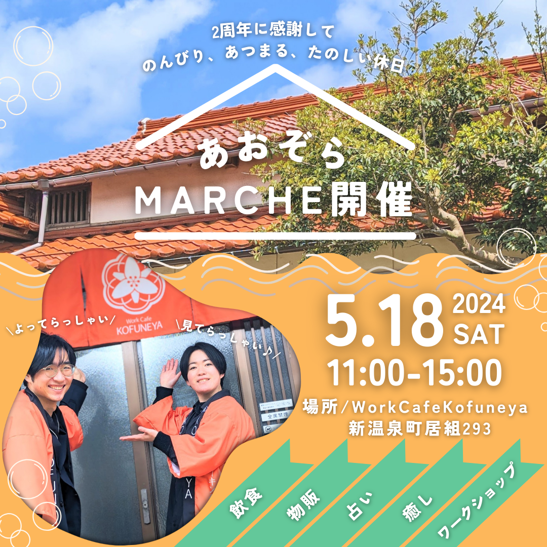 2024/04/16 12:11お世話になっております!WorkCafeKofuneyaの小舟です^^早いもので2024年3月26日でWorkCafeKofuneya2周年を迎えました!日頃の感謝を込めまして、また、構想当時から行いたかったマルシェを開催させていただくこととなりました^^カフェが平日しか開いていないこともあり、ご来店のタイミングを計りかねていた方にも、雪深い山陰地域への来訪を躊躇されていた方にも気候のよい今のタイミングでお会いできる場になればと思い、企画させていただきました^^今回は、オープン以来お世話になっている新温泉町、そして鳥取の方々にご出店いただき、大変にぎやかな空間となりそうです^^この場をお借りして、ご出店くださる皆様のことをご紹介させてください。◆YUKOさんUターン組の先輩移住者さんで、いつもわたしの話を聞いてくださったり、町内の方とつなげてくださる頼れるお姉さま!今回はタロット&数秘占い(15分1000円)をご提供くださいます♡わたしも占っていただけるの楽しみ!!◆山本さん新温泉町の山側、塩山というとっても見晴らしのいい素敵な場所で、お米作りや野菜作りをされている山本さん!趣味が講じてパン屋さんも始められて、今回パンやお菓子、冬の保存食かき餅をお持ちいただけることになりました♡パンはマジで早い者勝ち!笑◆セラピスト花織さん来店回数トップクラスのかおりん!2023年は月に1度出張施術にいらしてくださり、そのご縁で繋がれた方もたくさんいらっしゃいます!ふだんは鳥取吉岡で素敵なサロンをされてます♪今回は特別価格でイヤーキャンドル(40分4500円)、チャクラキャンドル(1箇所15分1800円※最大3箇所)をご提供くださいます♡受けなきゃ損!!◆KOKOROさん14年前、結婚を期にミャンマーから来られた英語講師のお姉さま♡大変な状況のミャンマーのために、なにか出来ることはないか?と、浜坂のシーグラスを使ったアクセサリー作りのワークショップや販売をされています!今回はシーグラスアクセサリーを店頭販売しております!売上は、ミャンマー支援に役立てていただきます♪◆アンボーさんわたしと同じく日本酒好き、、、が!!すごいレベルで日本酒好きなお姉さん!!地域おこし協力隊として昨年新温泉町にいらっしゃり、空き家バンクや移住定住のサポート、さらには但馬杜氏PRに関わっておられ、但馬杜氏さんの作っている日本酒を買い集めて、貴重な杜氏さんからの話を聞かせてくれます♡今回も圧巻のラインナップで、飲み比べをご提供くださいます♪日本酒好きの皆さま、ぜひご賞味ください!わたしもいただきます!!◆KOFUNEYA当店からは、山陰ジオパークの美しい海をイメージした「居組玉アクセサリー」のワークショップと新温泉町名物のじゃぶ&玄米おにぎりをご提供させていただきます♪1月に当店で開催いただいた移住者交流会でじゃぶのことを教えていただき、作ってみたところ大変好評で♪たくさん作りますので、召し上がってください^^ちなみに、今回出店いただく方々のうち、2名がウクレレ奏者♡さらに1名はバンド経験者!こりゃ演奏もしていただけるかな?!楽しみ楽しみ♪皆さんに楽しんでいただける1日になればと思います♪いえ、わたしが誰よりも楽しんでいるかと思います笑地域問わず、ぜひ遊びにいらしてください♪♪追加情報等はInstagramにてご案内いたします^^フォローしてください♪https://www.instagram.com/cafe_kofuneya/ もっと見る暑中お見舞い申し上げます