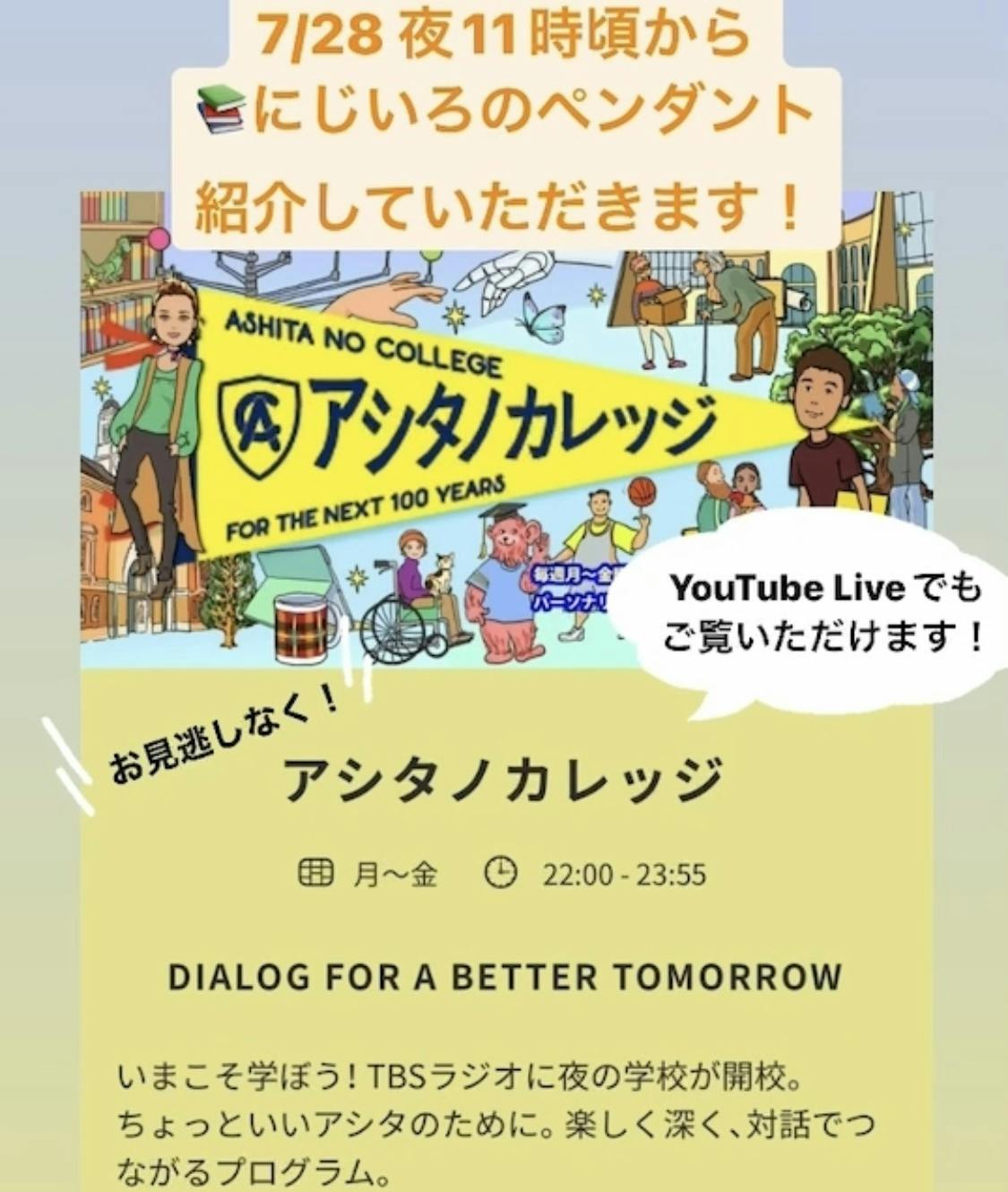 明日、7月28日のTBSラジオ「アシタノカレッジ」にて23時頃より、わたしたちが作った絵本「にじいろのペンダント」が紹介されます。