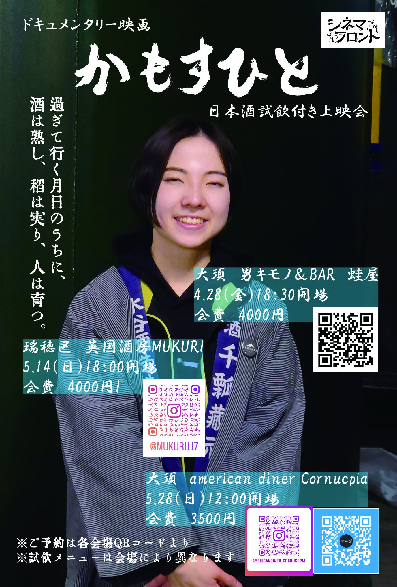 2023/03/24 15:32「かもすひと」監督の児玉篤史です。前回のイベントに続き、名古屋市内にて4月から5月にかけて3回の試飲付き上映会を開催することとなりました。試飲メニューの内容は、会場により異なります。ご予約は各店舗または私までメッセージにてご連絡下さい。4/28(金曜日)18:30より、大須の男キモノ&BAR蛙屋にて。参加費は4000円です。お店は普段は手作りのフードが美味しいバー営業と、オリジナルの男性用着物の販売も行っています。こちらのみ平日夜間開催です。定員16名様と少数のため、ご予約はお早めに。https://kaeruya.net/archives/information/kamosuhito5/14(日曜日)18:00より、瑞穂区の英国酒房 MUKURIにて。参加費は4000円です。スコッチウイスキーを始めとしたイギリス産のお酒、また日本を含め世界各国のウイスキーも充実。その時ある旬の食材を活かした独創的な料理にも定評があります。https://www.instagram.com/mukuri117/5/28(日曜日)12:00より、大須のamerican diner Cornucopiaにて。参加費は3500円です。肉厚のハンバーガーやTボーンステーキなどが自慢のアメリカンダイナーです。ダーツやボードゲームもあり、時々行われるゲームイベントも盛り上がっています。https://www.instagram.com/americandiner_cornucopia/以上の三会場にて、それぞれ異なる試飲メニュー付きの上映会を開催致します。奮ってご参加ください。 もっと見る