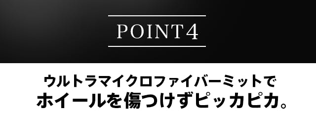 ④ 最後にウルトラマイクロファイバーミットで水分を磨くように拭き取ると、ホイールの輝きがいっそう増します。